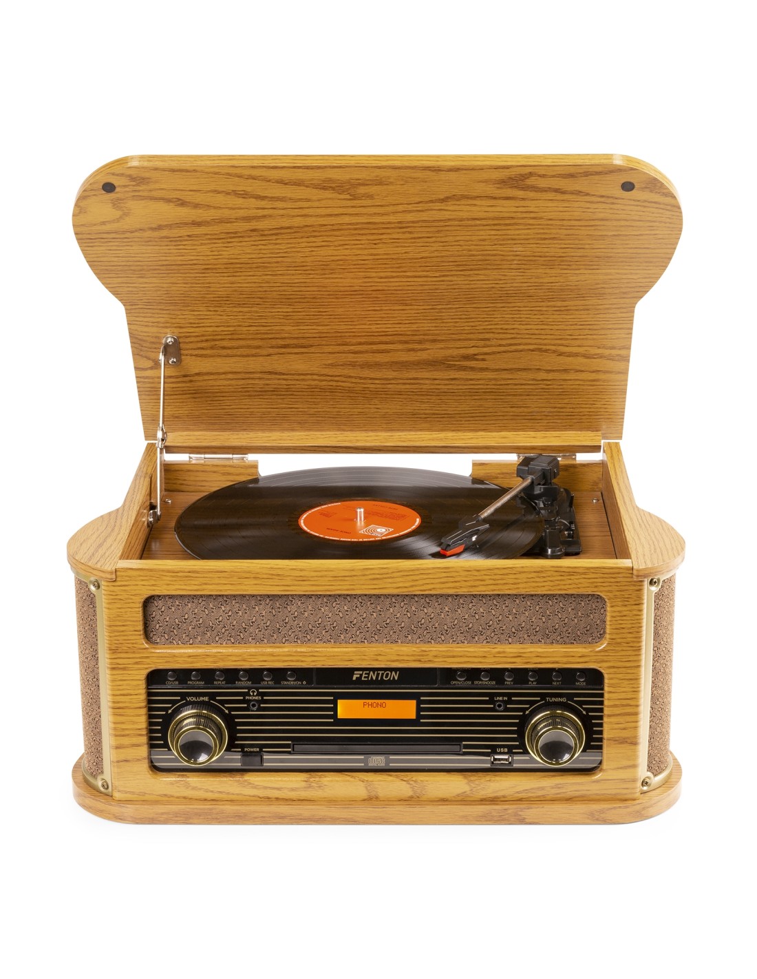 Retroceda en el tiempo y reviva los estilos y sonidos de sus pistas favoritas con el sistema de tocadiscos Memphis de Fenton. Con una gran variedad de opciones de reproducción diseñadas para reproducir discos de vinilo, CD, casetes y radio digital con conectividad USB, todo presentado dentro de este dispositivo multifuncional. El tocadiscos de vinilo de tres velocidades reproduce discos de 33, 45 y 78 rpm, con compatibilidad adicional de CD y casete para cargar sus pistas favoritas de la vieja escuela. El sintonizador de radio se puede ajustar en las estaciones de radio DAB + y FM para sintonizar diferentes canales, llenando la habitación con el sonido de audio claro de los 2 altavoces de 25W.