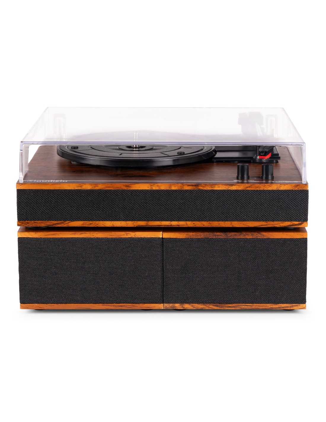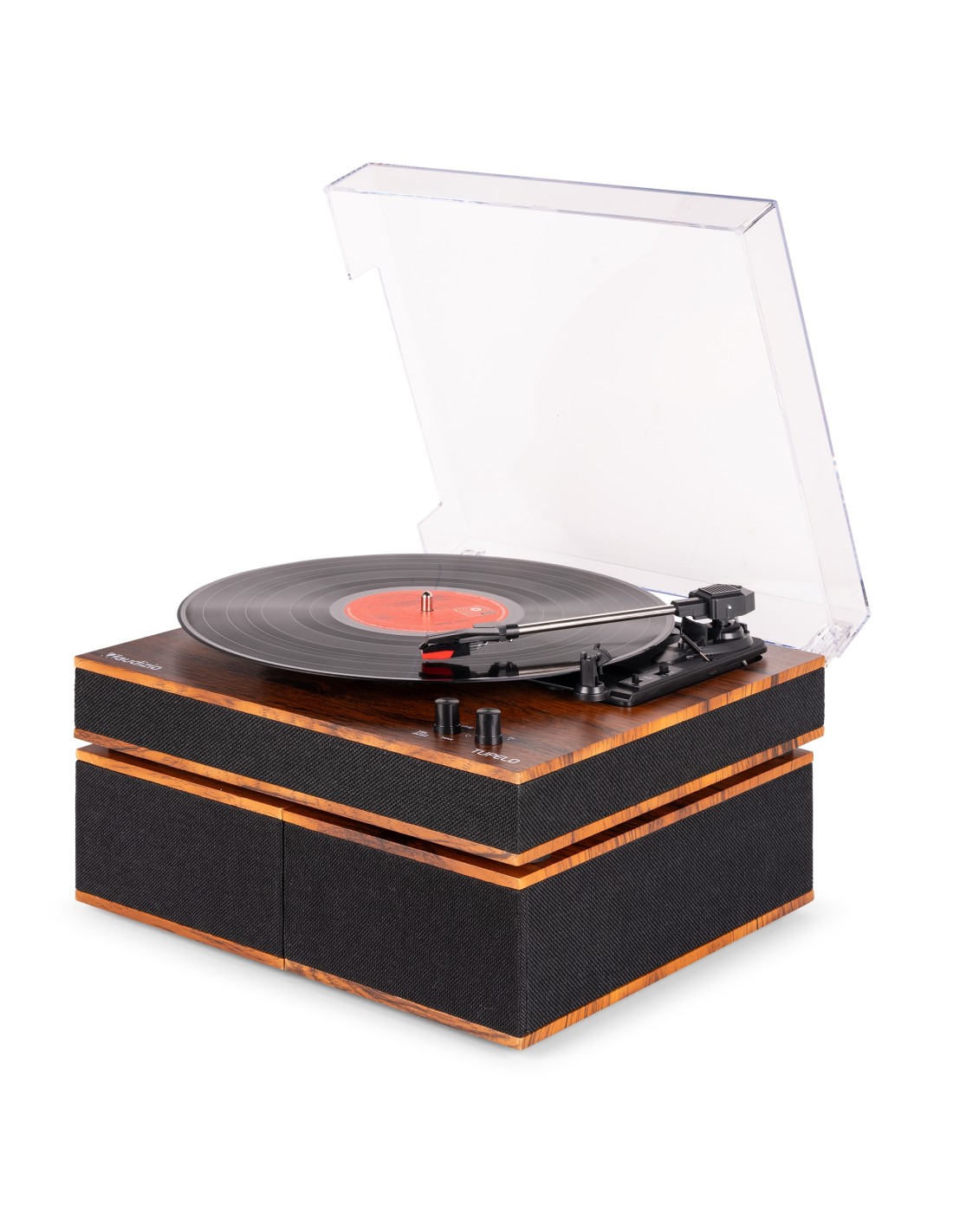 El tocadiscos Audizio Tupelo combina la reproducción clásica de vinilo con la comodidad moderna en un diseño elegante. Disfruta de tus discos favoritos o transmite música de forma inalámbrica mediante el streaming de BT. Los altavoces estéreo duales de rango completo incluidos ofrecen un sonido potente, lo que facilita disfrutar de la música nada más sacarlo de la caja.
