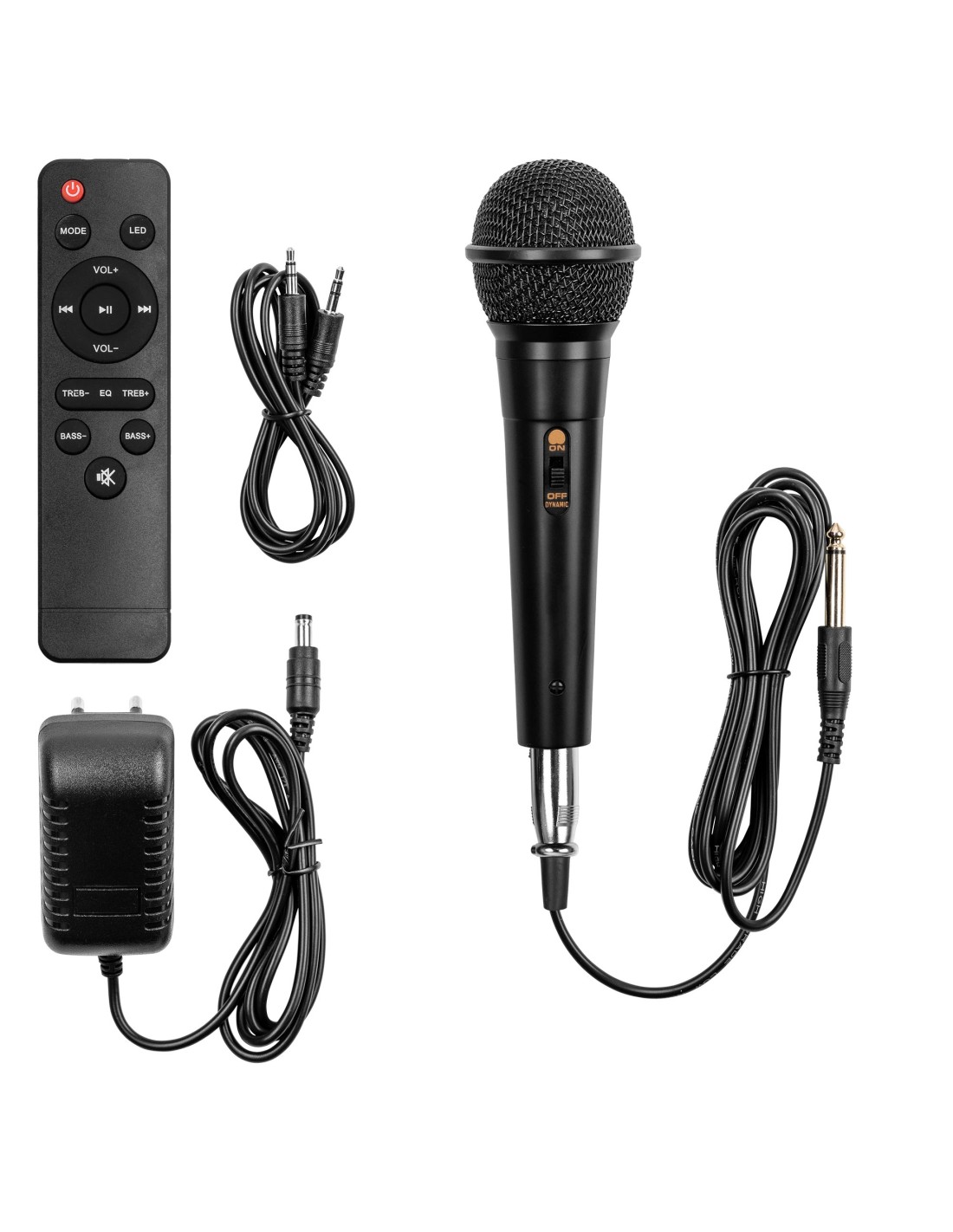 Incluye micrófono y control remoto.