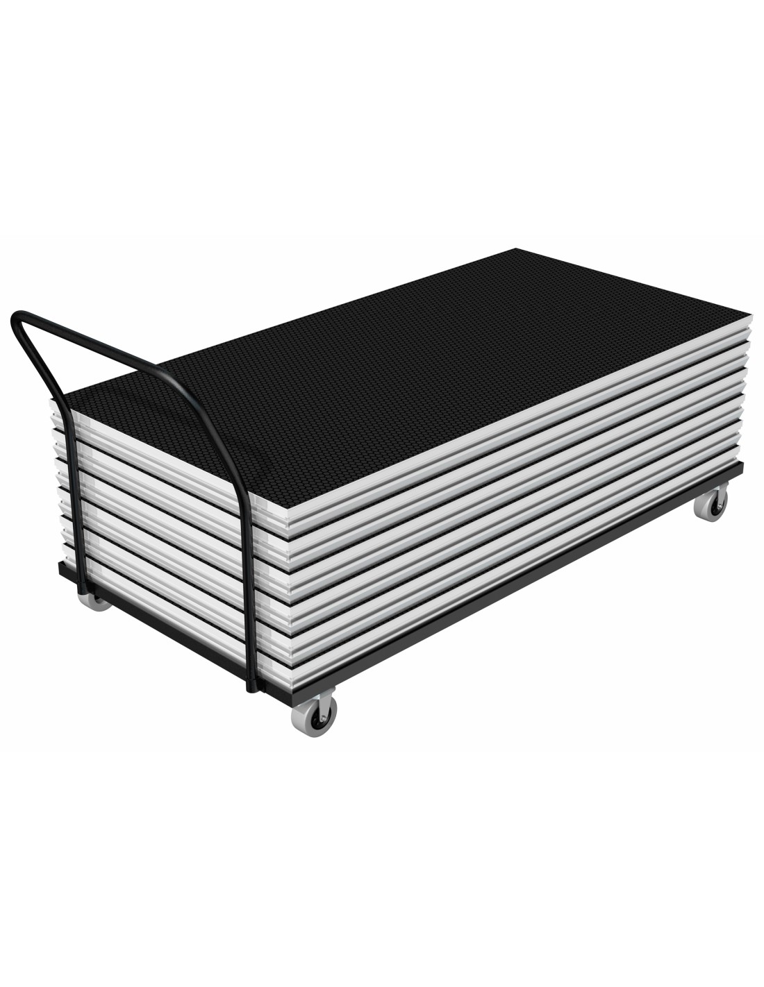 Este trolley puede transportar 10 tarimas Deck750 en posicion horizontal. La forma ideal de transportar tarimas de un sitio a otro con seguridad.
