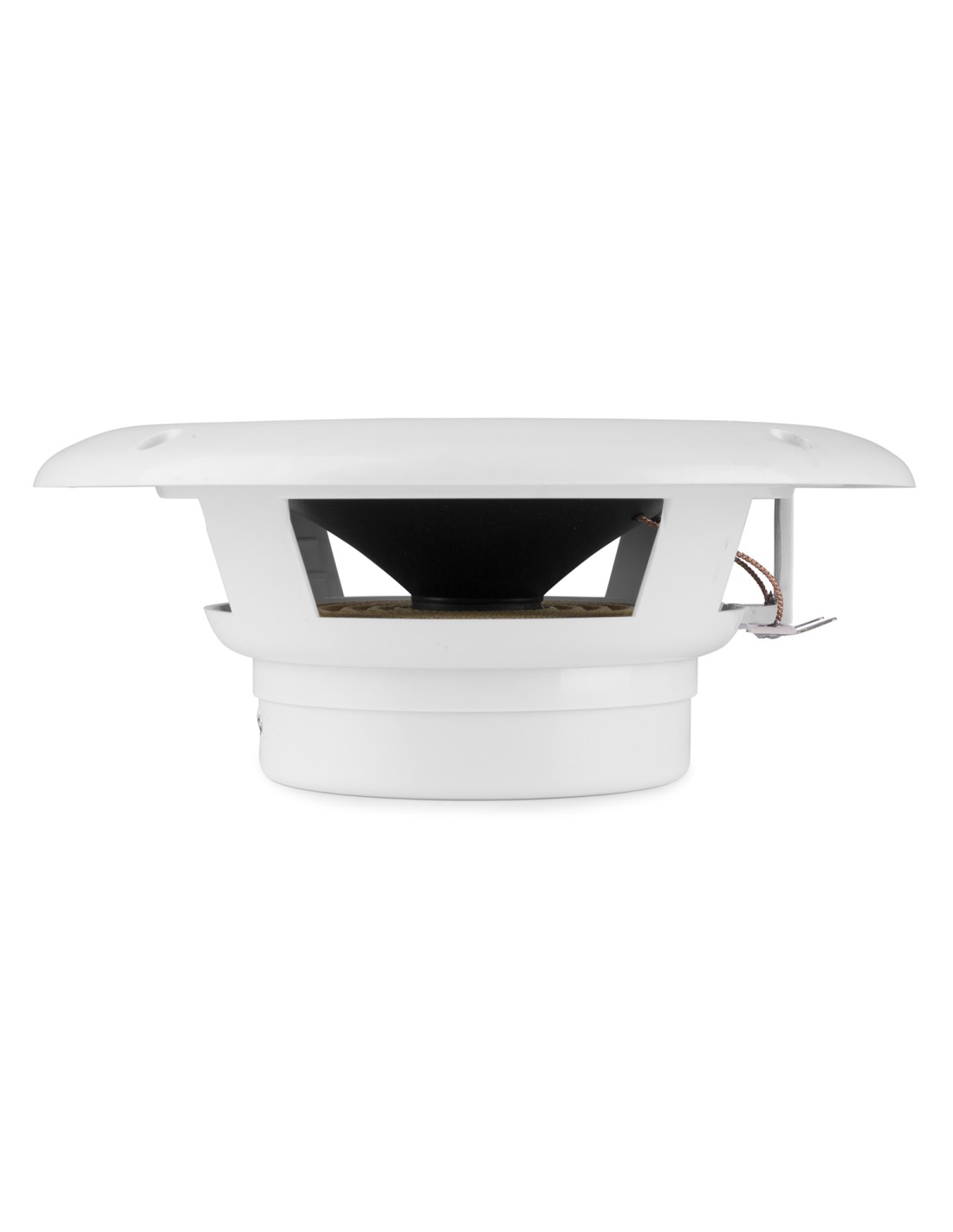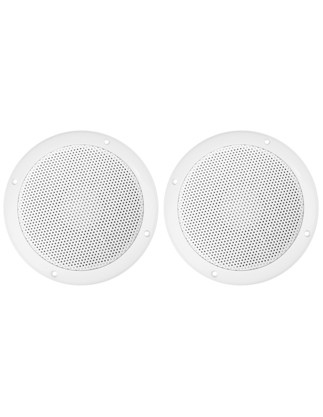 Conjunto de 2 altavoces resistentes al agua para panelar o colocar en techo. Su diseño resistente a elementos permite su uso con lluvia, salpicaduras y humedad (no sumergido). Tambien son resistentes a los rayos del sol UV por lo que no se rompen por exposicion prolongada. Ideal para barcos o uso en zonas humedas como piscinas o baños, etc.