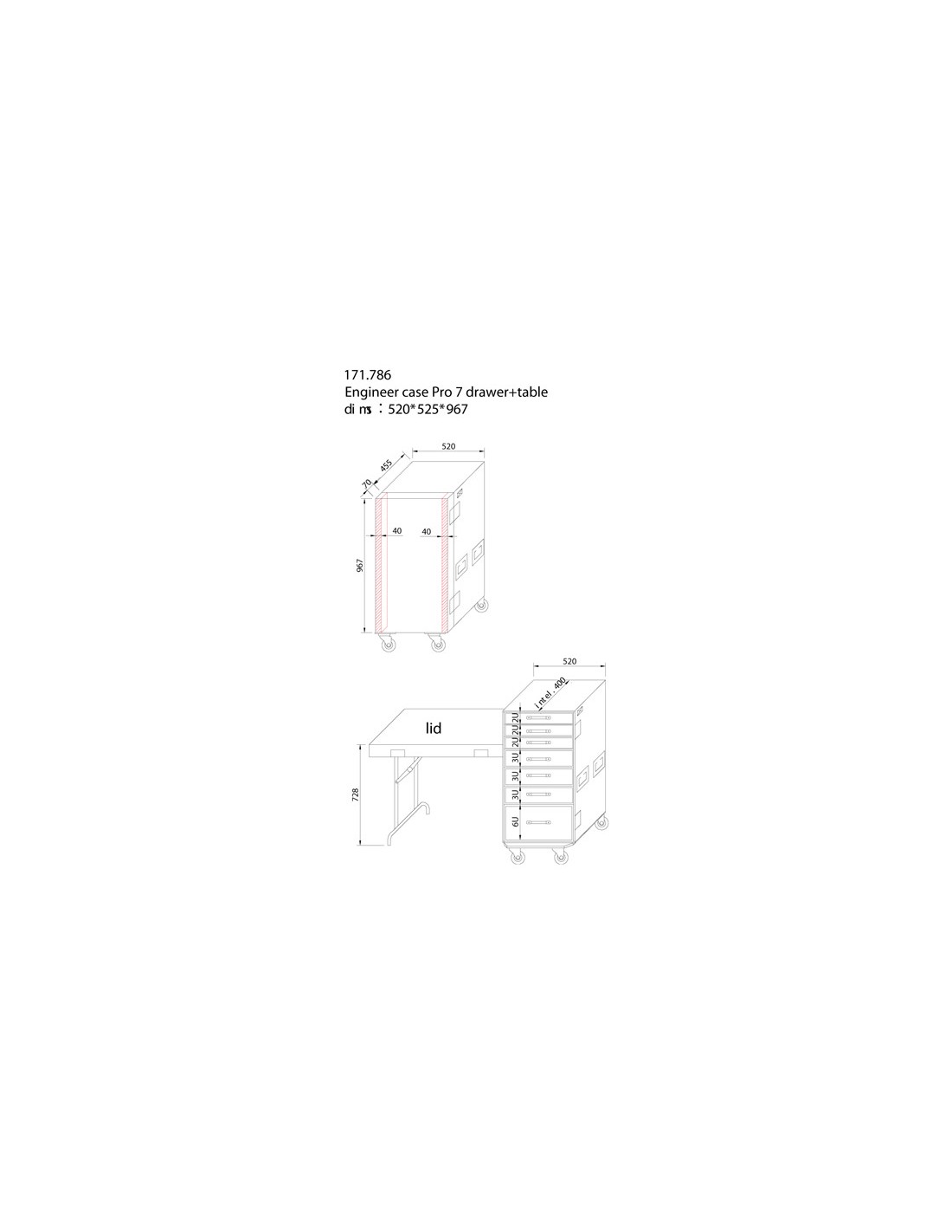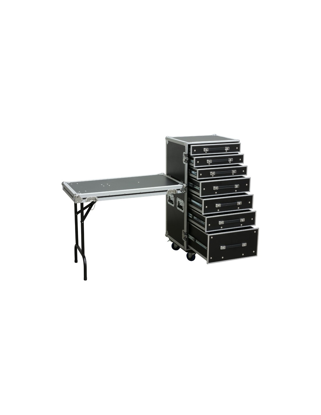 Este mueble de trabajo tiene un frontal removible y 7 cajones de 2,3 y 6U. La altura y disposicion de los cajones puede variarse a voluntad. Los cajones estan forrados con espuma dura. La mesa puede utilizarse como banco de trabajo siendo muy util para los "tecnicos moviles".