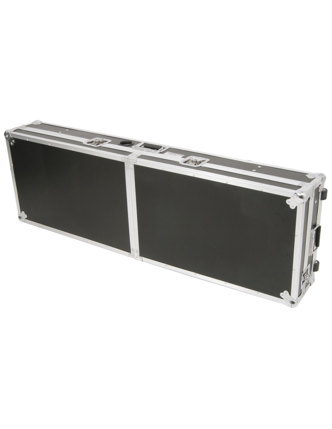 Flightcase 19" de gran solidez para una mesa de mezclas DJM de 8U, 2 lectores CD CDJ y espacio para guardar 80 discos CD. Equipado con un panel plegable con visagras para sujetar un portatil PC y ruedas.