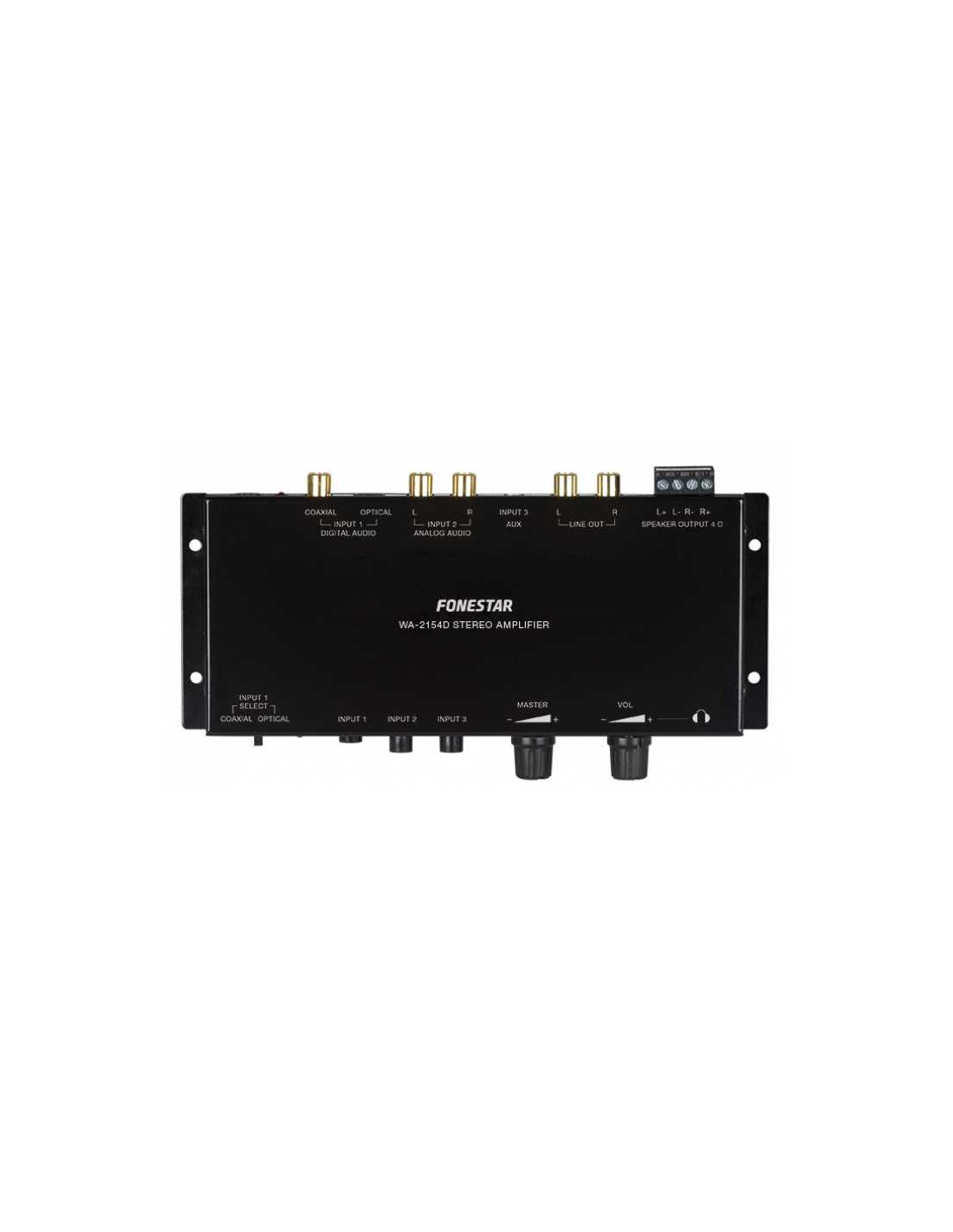 CARACTERÍSTICAS | Amplificador estéreo compacto clase D. Caja de acero para montaje en superficie. Entradas de audio digital y analógico. Salida de altavoces estéreo. Salida de auriculares. | |