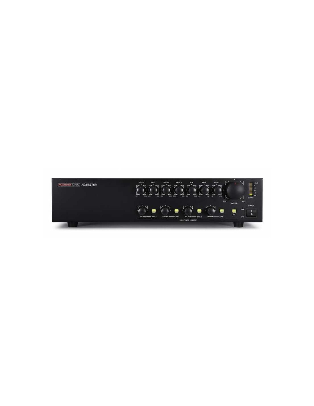 CARACTERÍSTICAS | Amplificador de megafonía.4 zonas de altavoces seleccionables con control independiente de volumen.Alimentación phantom.Prioridad de avisos. | |