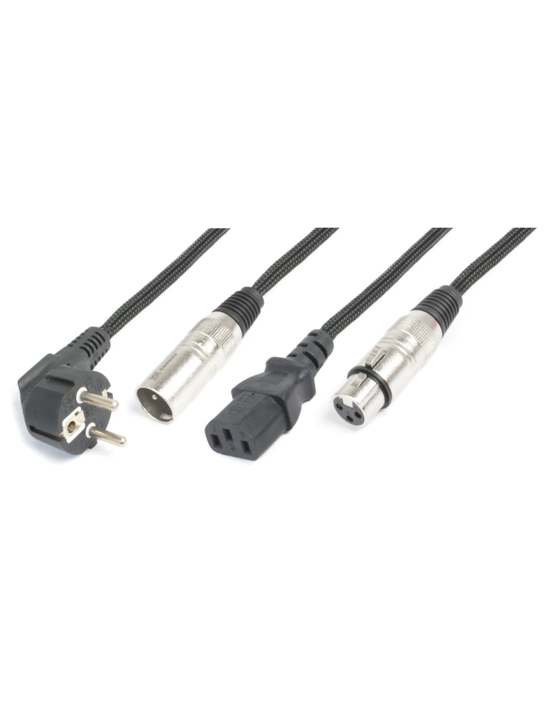 Cable de alimentacion y señal en una sola conexion. Con conectores de alimentacion Powercon, Shuko y IEC; y conector XLR de señal DMX no se necesita ningun otro cable para conectar profesionalmente sus efectos LED, cabezas moviles y baños de color de forma facil y limpia.