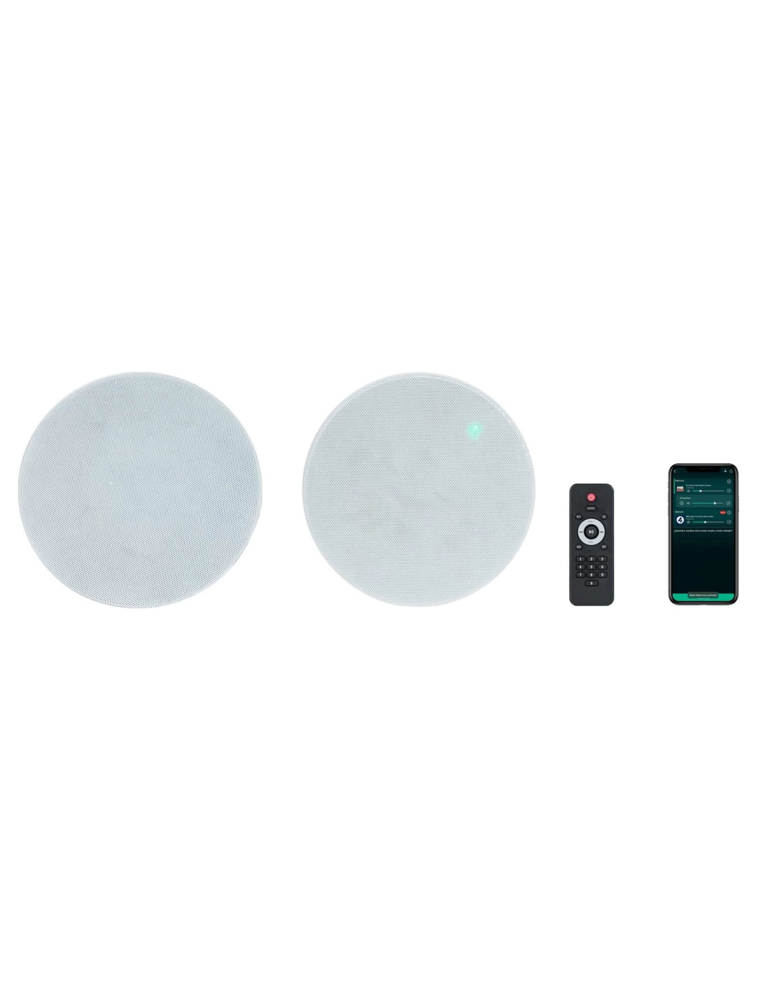 Pareja de altavoces de techo Wi-Fi. Reproduce música desde tu smartphone, tablet, Windows o Mac (compatible con DLNA y Airplay). App para control desde smartphones y tablets (iOS y Android), que permite conectar con servicios de música online y radio internet. Función multiroom. Altavoz activo con amplificador y salida para altavoz pasivo. Prioridad en entrada auxiliar, seleccionable. Selector de volumen máximo (50%, 100%). Modo estéreo/mono, seleccionable. Rejilla magnética sin marco y bajo perfil. Mando a distancia.