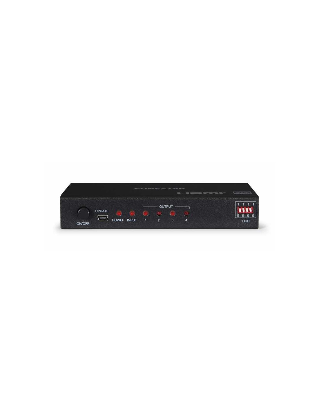 CARACTERÍSTICAS | Distribuidor amplificador HDMI 1 x 4. Compatible con 4k x 2k, Full HD 1080p, Full 3D. Función EDID, selecciona automática o manualmente la resolución óptima para todas las TV. Ancho de banda 8'91 Gbps. | |
