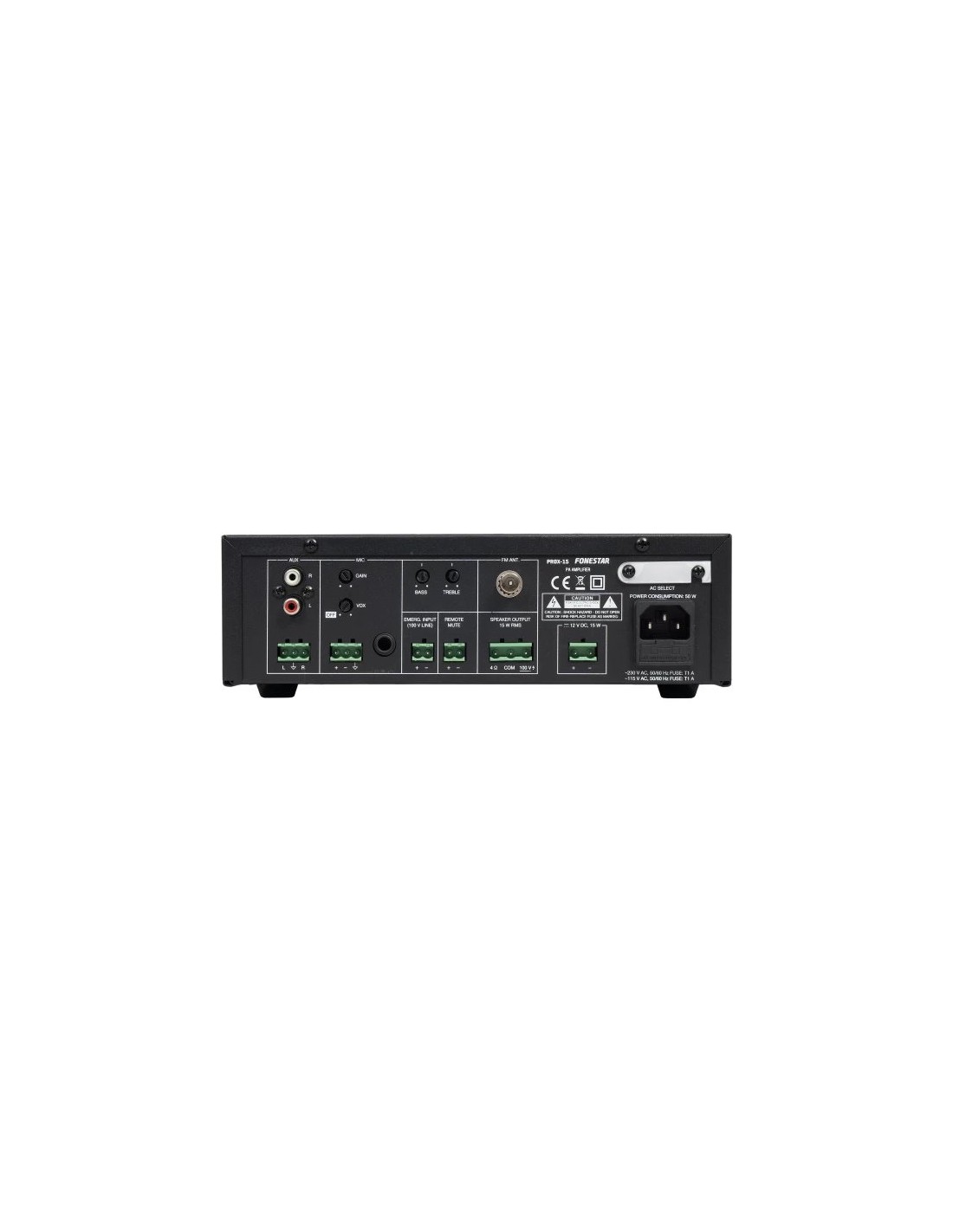 FUNCIONES | Prioridad de entradas: Entrada de Emergencia 100V con máxima prioridad, atenua el resto de entradas. Mute por cierre de contactos, atenua todas las entradas excepto la entrada de Emergencia 100 V. Micrófono con prioridad sobre entrada Auxiliar y Reproductor, por nivel de señal, seleccionable Indicadores luminosos de encendido, protección, pico de señal y señal de salida Refrigeración por inducción sin ventilador | |