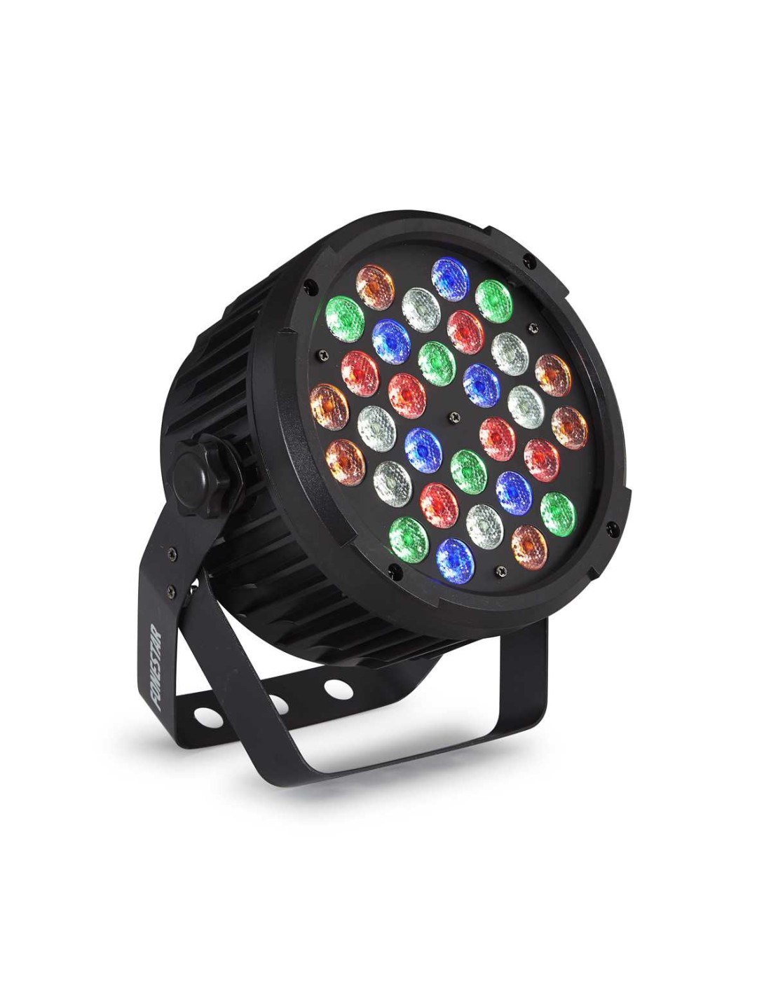 CARACTERÍSTICAS | Foco PAR plano RGBWA. Modo automático, modo estático, activación por sonido y modo maestro/esclavo. Ajuste de colores, dimmer, estrobo y velocidad de variación ajustable mediante controladora DMX. Micrófono incorporado. | |