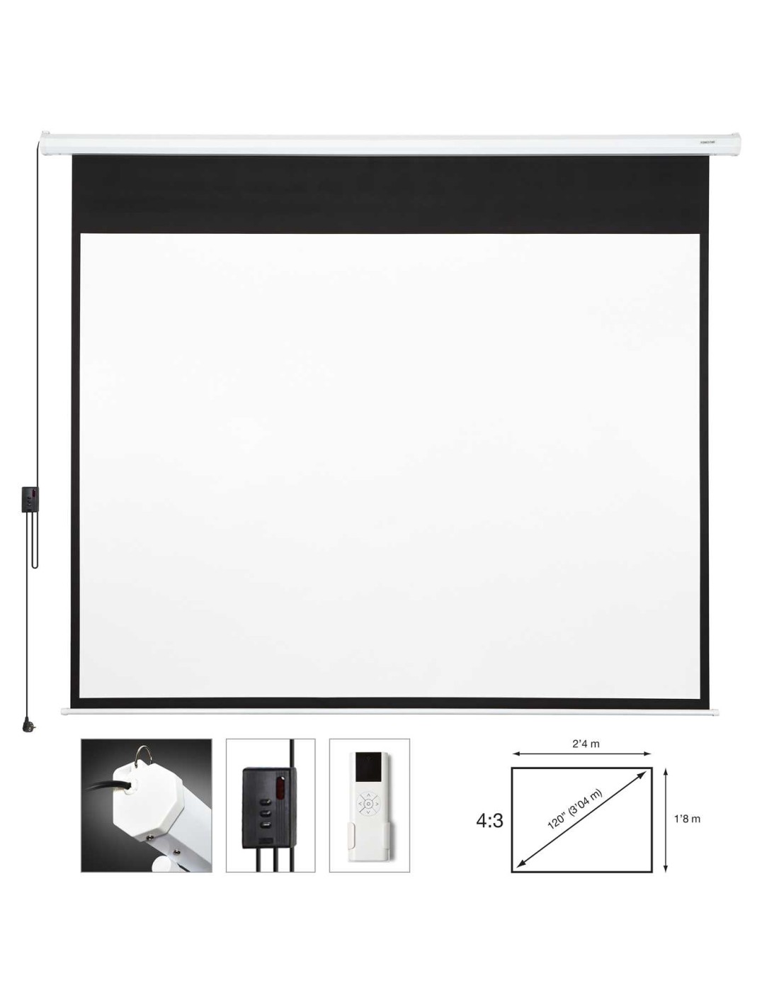 CARACTERÍSTICAS | Pantalla de proyección eléctrica. Motor síncrono. Pulsadores de subida, bajada y parada. Mando a distancia RF. Final de recorrido ajustable. Instalación en pared o techo. | |