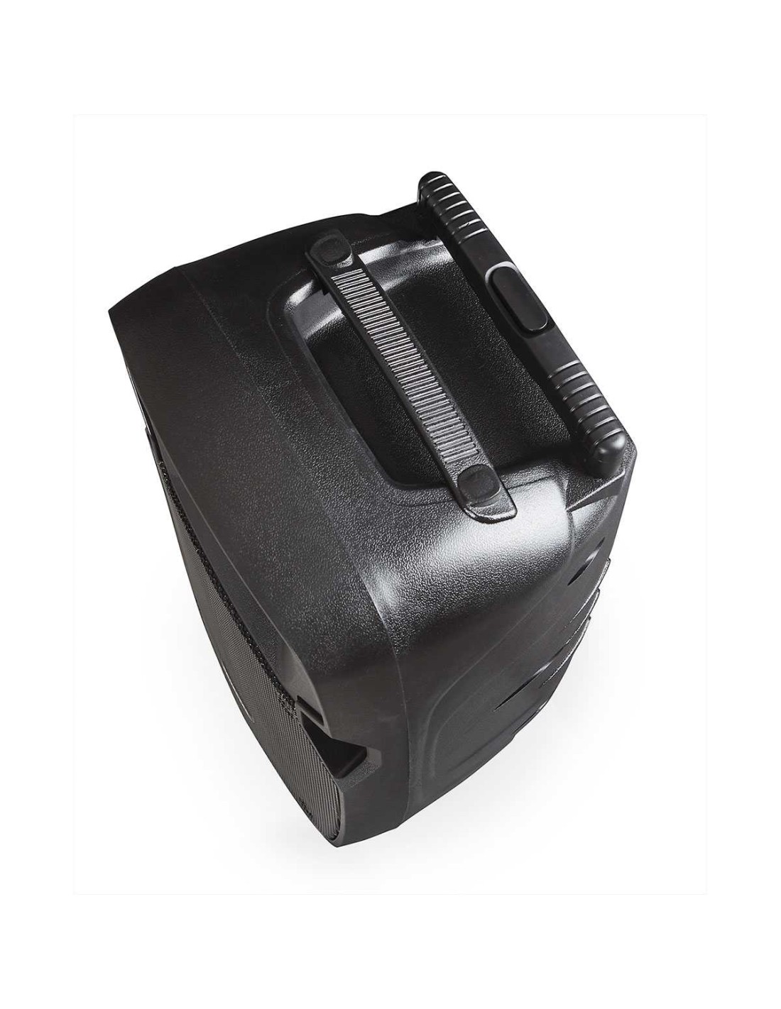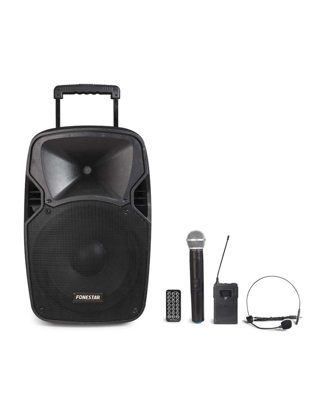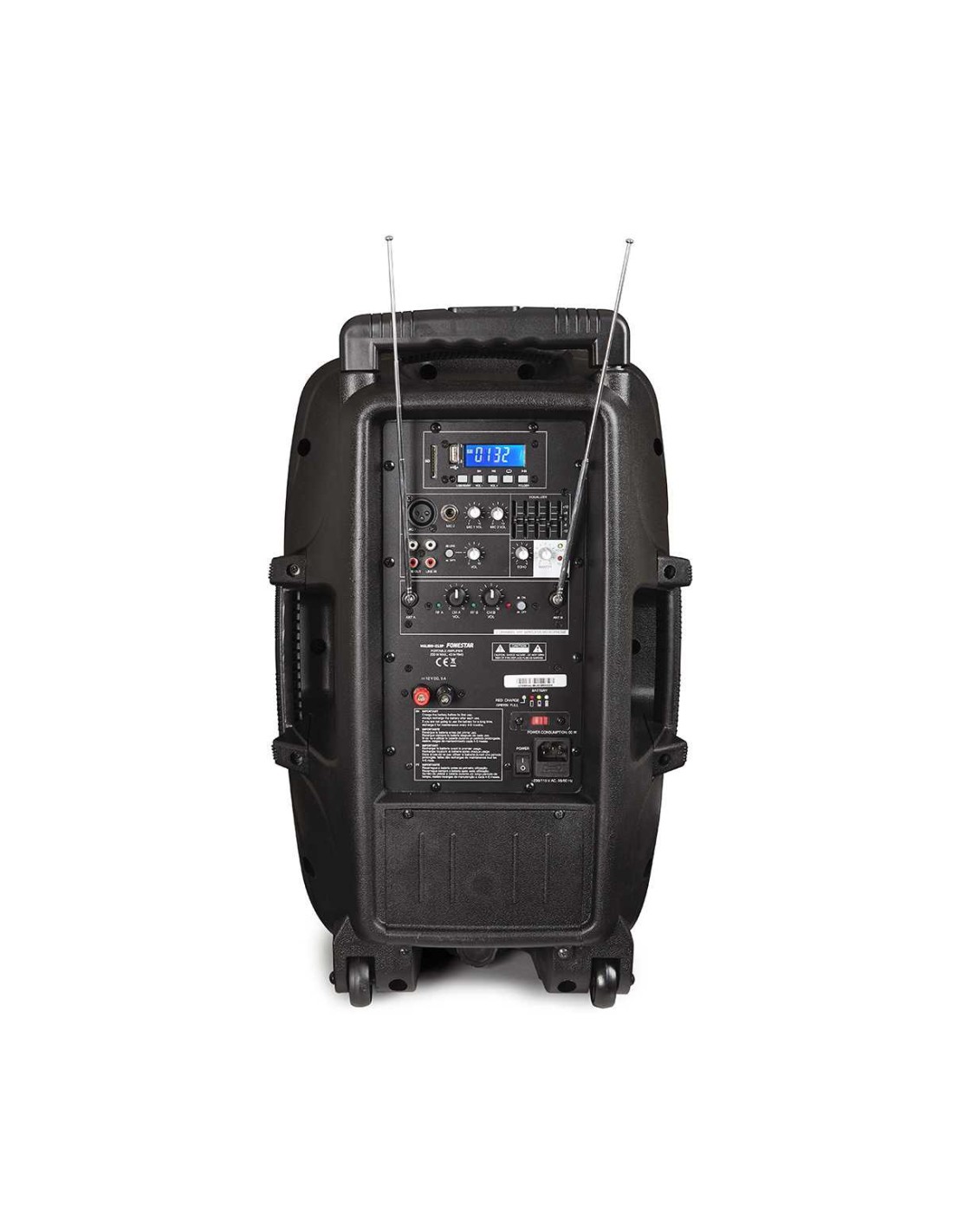 CARACTERÍSTICAS | Altavoz portátil. 2 micrófonos inalámbricos VHF, 1 de mano y 1 de cabeza (191'900 MHz y 174'300 MHz respectivamente). Reproductor USB/SD. Batería recargable de Li-ion. Función eco y control de tonos. Carro de transporte trolley. Mando a distancia. Orificio en la base para tubo de 35 mm. | |