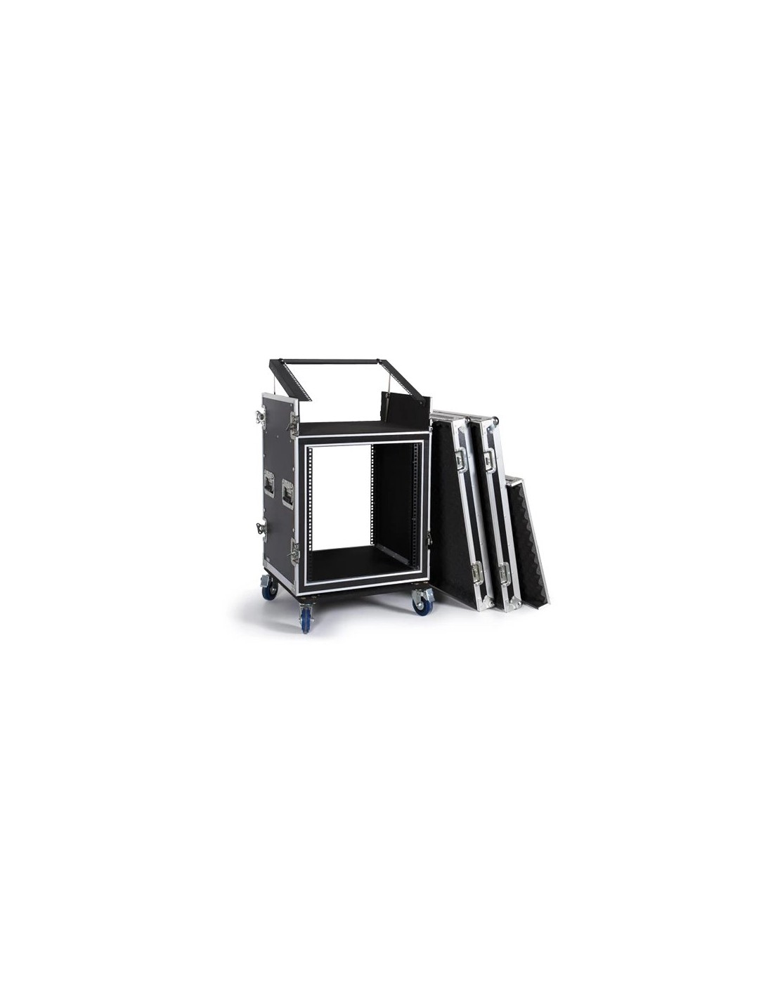 Rack 19" antishock con soporte superior para equipos de sonido e iluminación. En madera contrachapada revestida. Protección contra golpes a base de foam de 25 mm de alta densidad. Tapas frontal, trasera y superior con cierre hermético, asas de transporte, ruedas con freno y cantoneras metálicas de protección. Construcción robusta para transporte y protección del equipo montado en el rack. Acabado negro.