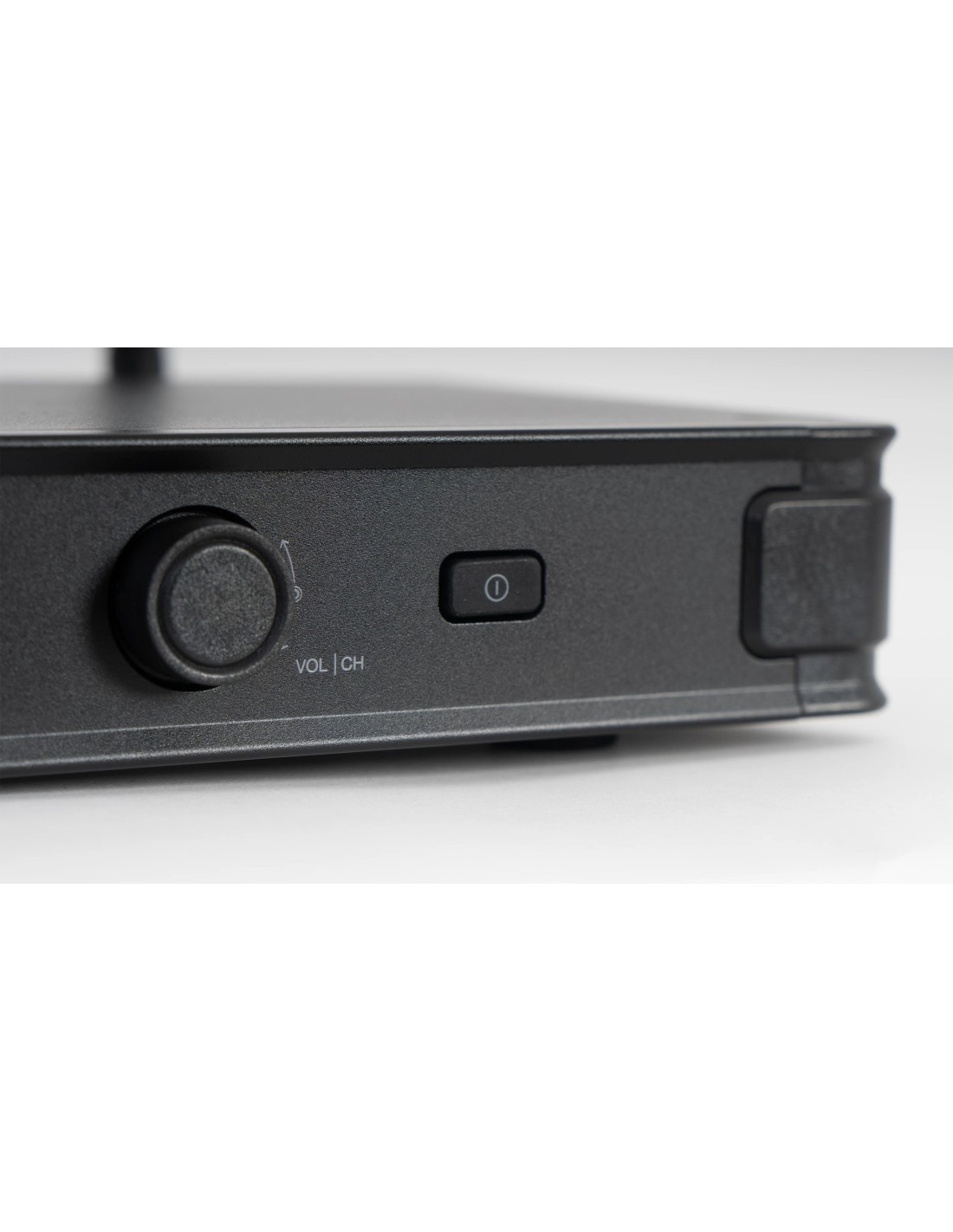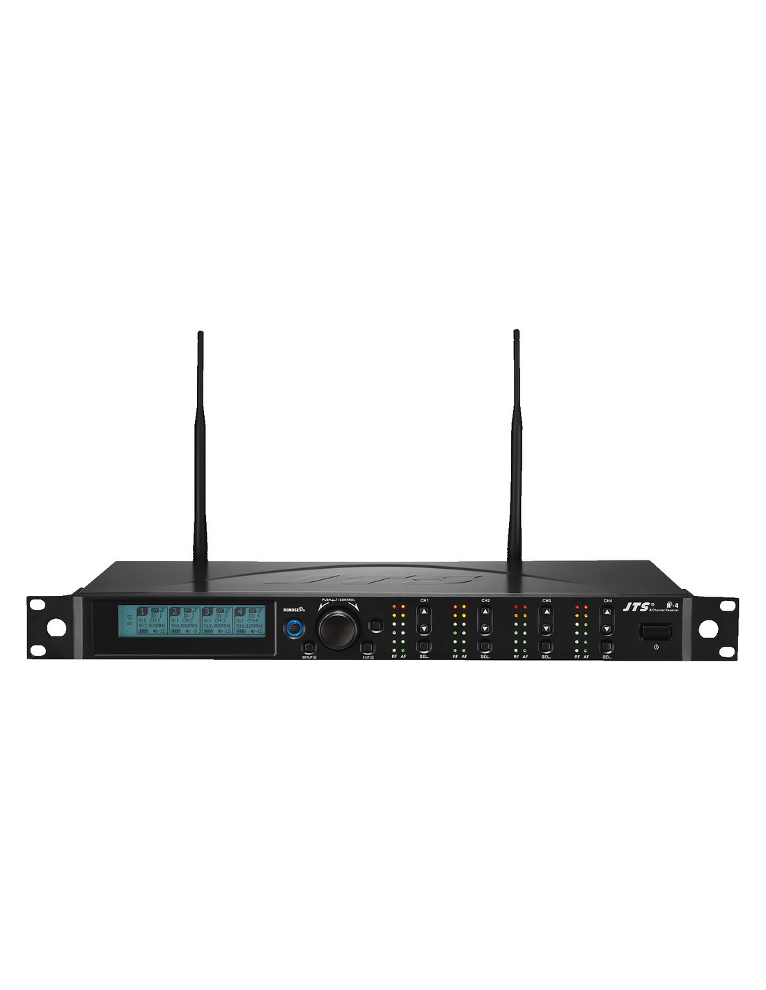 Receptor con pantalla a color de información; canal de transmisión, nivel de pila en el micrófono, etc. Indicador de señal de radio frecuencia y señal de audio.