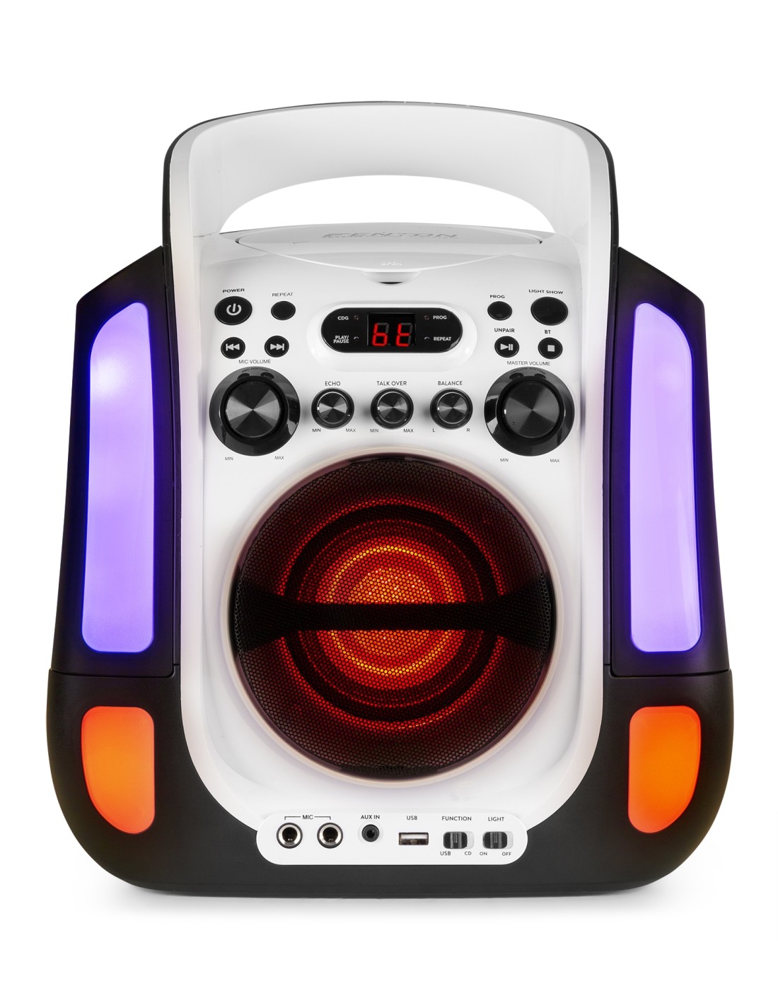 El sistema karaoke SBS30 es totalmente portátil y con efectos de luces. El control de echo digital hará que tu voz este en tono y suene más profesional. El control Auto Voice Control (AVC) ayuda a aprender rápidamente el tono de la canción y se convierte en tu ayudante si te olvidas de la letra. El SBS30 está equipado con tecnología BT para hacer streaming de tu música favorita además de un reproductor CD y conexión USB. Se puede conectar esta unidad a una pantalla de TV o proyector por la salida de video de la parte trasera, y si necesitas más potencia puedes conectar la unidad a un amplificador HiFi o etapa de potencia. Incluye 2 micrófonos (con cable) con función echo para completar tu fiesta karaoke.