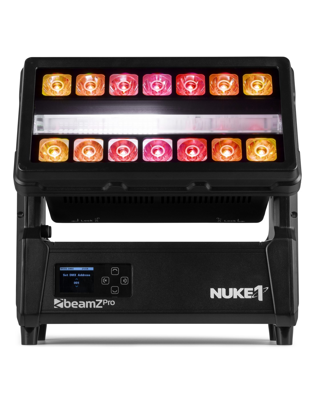 El estroboscópico/foco motorizado Nuke1 es una potencia de iluminación dinámica diseñada para brindar versatilidad e impacto. Con un rango de inclinación motorizado de 180°, este dispositivo híbrido cambia sin problemas entre un potente estroboscópico y un foco colorido, o una cautivadora combinación de ambos efectos. Con 96 LED de color blanco frío de 10 W y 14 LED de alta potencia RGBW de 40 W, el Nuke1 proporciona una paleta brillante de colores y una luz blanca intensa. Las zonas asignables por píxeles, el control DMX y los programas automatizados hacen que crear impresionantes efectos de iluminación sea muy sencillo. Su clasificación de impermeabilidad IP65 garantiza un rendimiento confiable en exteriores, lo que convierte al Nuke1 en una opción ideal para eventos tanto en interiores como en exteriores.