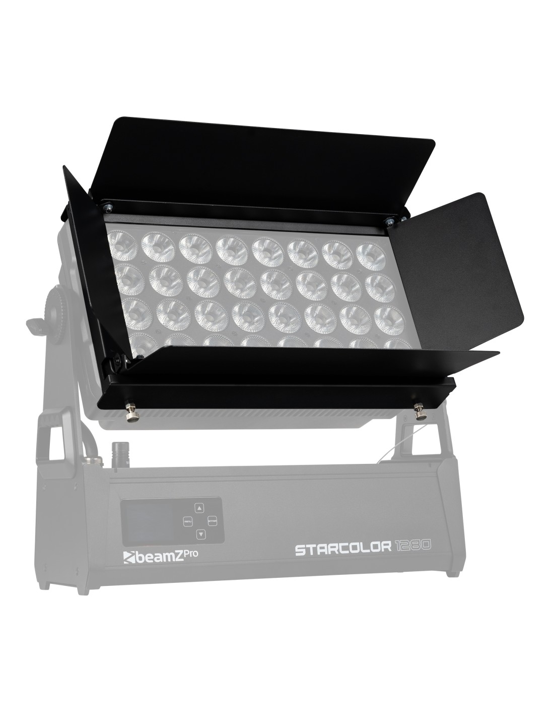 Barndoor desmontable, apto para la serie StarColor 1280. Las palas de apertura estrechan la extensión del haz del efecto.