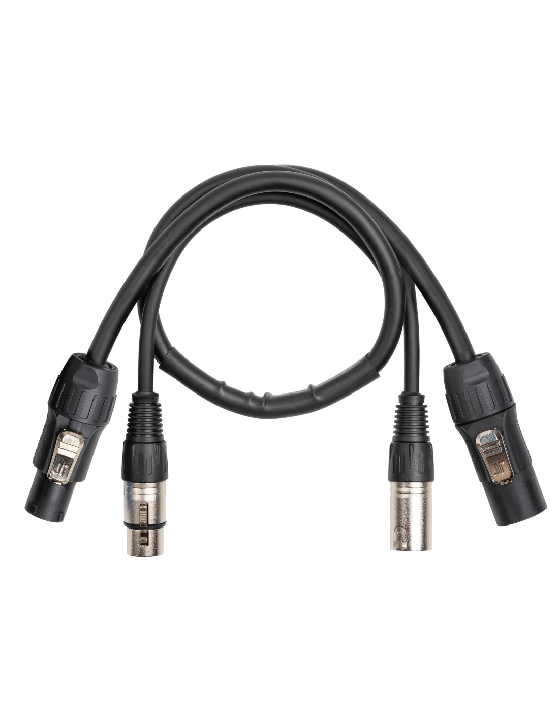 Cable de alimentacion y señal en una sola conexion. Con conectores de alimentacion Powerconnector TR y conector XLR de señal DMX no se necesita ningun otro cable para conectar profesionalmente sus efectos LED, cabezas moviles y baños de color de forma facil y limpia.