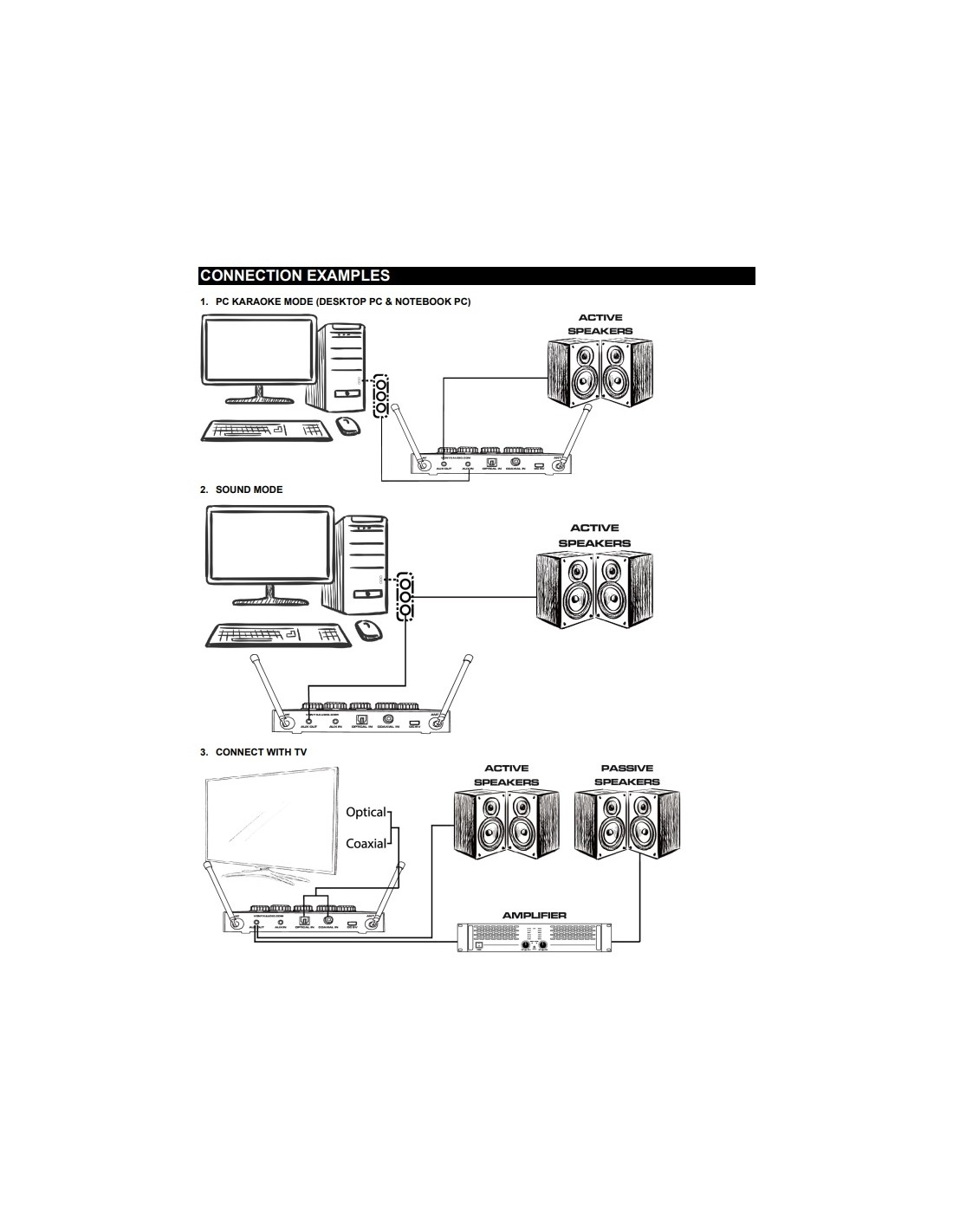 Atención: este Sistema solo incluye el mezclador y los micrófonos. Usted debe tener un equipo de amplificación (altavoces y amplificador) para que este sistema suene.