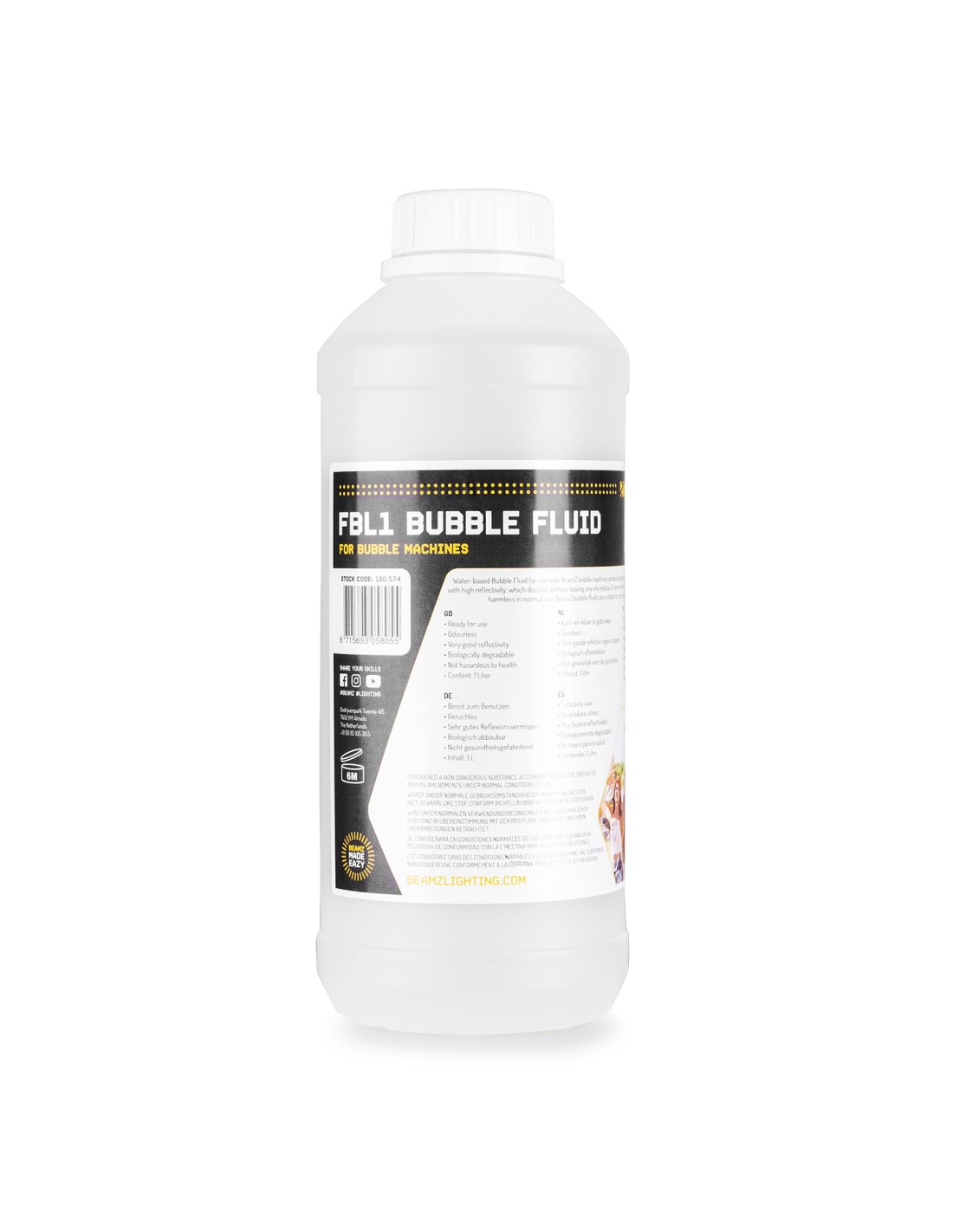 Liquido de burbujas con base de agua para usar en las máquinas de burbujas de BeamZ, para uso prolongado, conseguir burbujas ligeras, buena reflectividad, y disolución sin dejar rastro aceitoso. Respetuoso con el medio ambiente y completamente inocuo en su uso normal. Los líquidos de burbujas BeamZ se pueden usar en cualquier máquina de burbujas estándar.