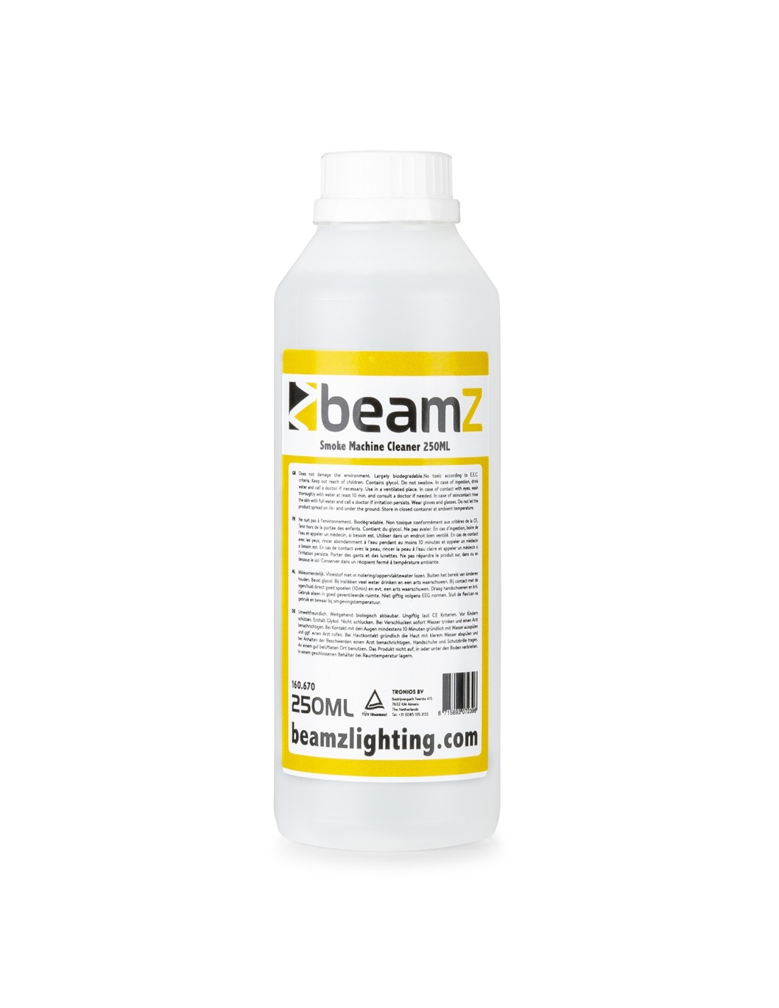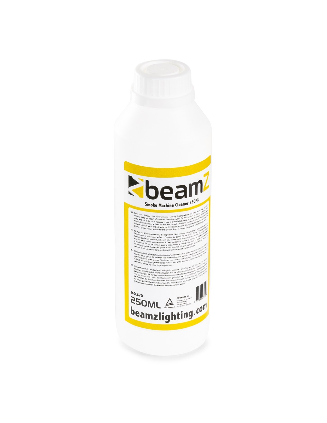 Líquido especial limpiador de máquinas de humo y niebla con base de agua. Este fluido limpia los restos de humo y niebla que quedan en las partes mecánicas de la unidad.