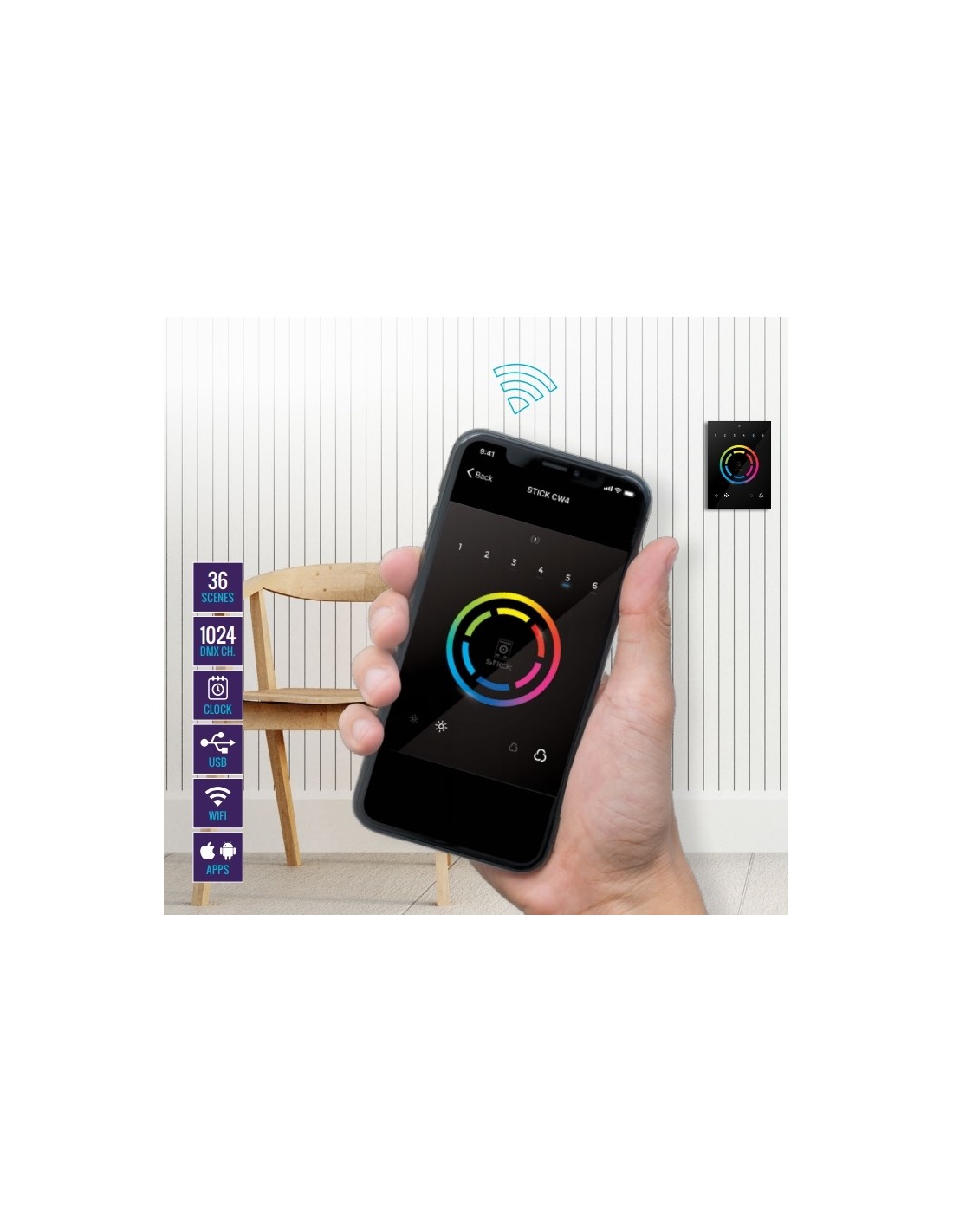 El controlador de luces programable STICK-CW4 para luminarias RGB y RGBW, ha sido diseñado alrededor de una rueda de color. El controlador es programablke por USB desde un PC o Mac usando el software ESA2 o Arcolis, Lightpad y Easy Remote Pro software. Hasta 36 escenas se pueden almacenar en el controlador y llamarlos directamente via seis botones de escena touch sensitive. Solo conecta la unidad, inicia el software de programación y crea el show, pulsando la tecla “escribe en memoria” para almacenar el show en la memoria autonoma. Un botón en el centro de la rueda de colores se usa para saltar entre las escenas o resetear los cambios de color. Ideal para luminarias LED, RGB, RGBW o cualquiera con DMX, el STICK-CW4 se ha diseñado para ofrecer el control perfecto con panel de cristal para cualquier sistema de iluminación arquitectural o de interiores (residencial o comercial).