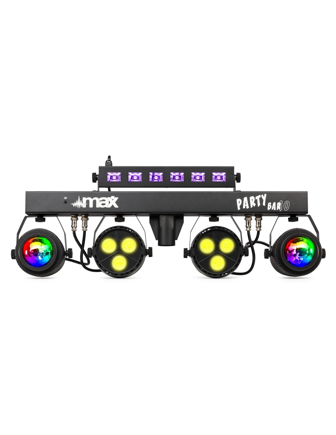 La serie MAX PartyBar consiste en varios kits completos que incluyen efectos de luz LED espectaculares. Todos los kits incluyen LEDs de alta intensidad en varios colores. Esta serie de Party Bars es “plug and play” y puede controlarse vía DMX, mando a distancia IR o auto y ritmo de la música con programas seleccionables desde el panel display LED con botones. Un trípode especial está incluido para poder colocarlo fácil y rápidamente. Especialmente diseñado para escenario, fiestas, animadores y otros eventos.