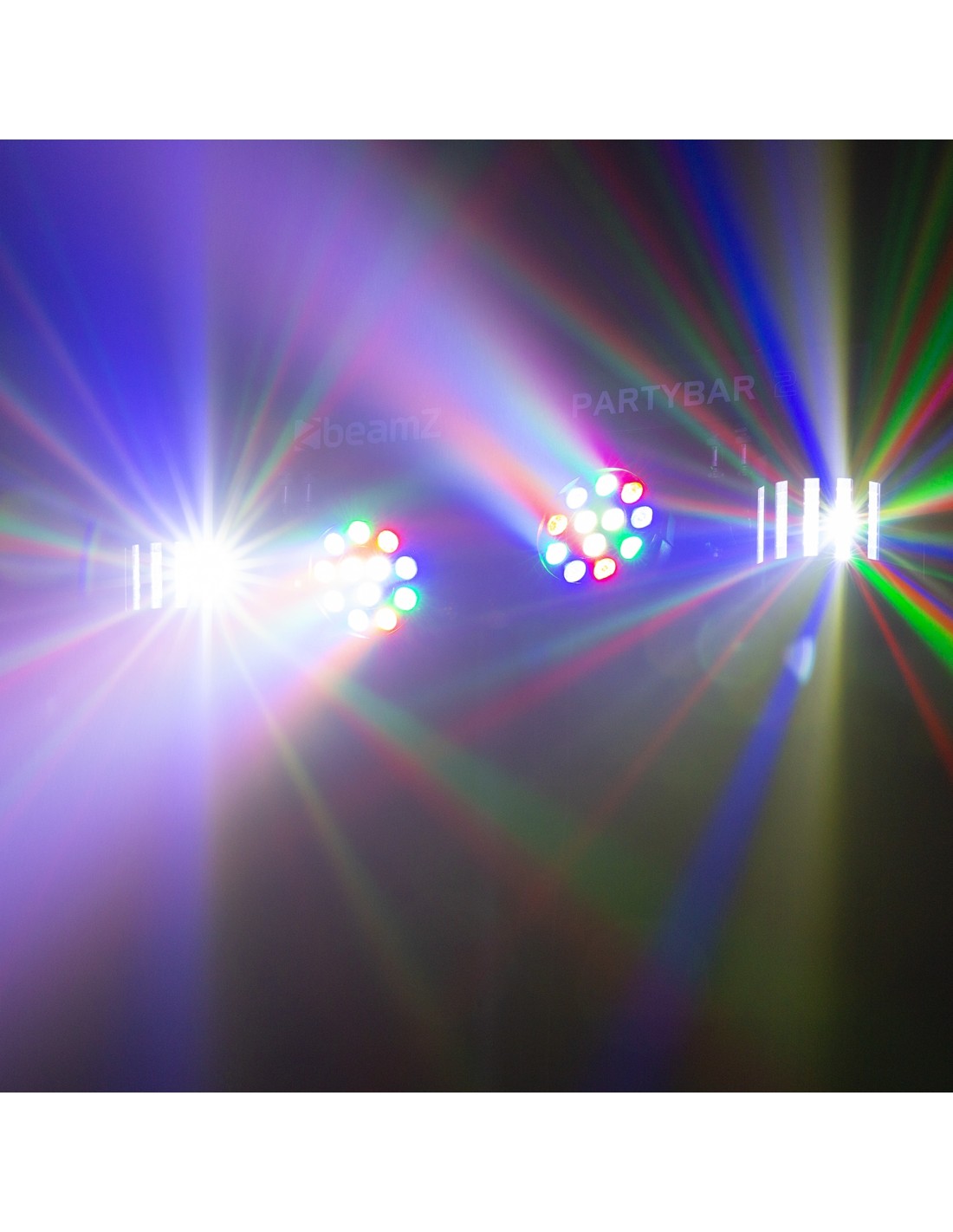 El Partybar2 es una solucion DJ completa que incluye 2 focos PAR de alta intensidad con Led RGBW y 2 efectos Derby. El Partybar2 puede conrolarse por DMX, Mando a distancia IR o auto y ritmo de la musica con programas seleccionables desde el panel de control. Incluye tripode para una rapida y facil colocacion. Diseñado especialmente para escenario, fiestas, animadores y otros eventos especiales.