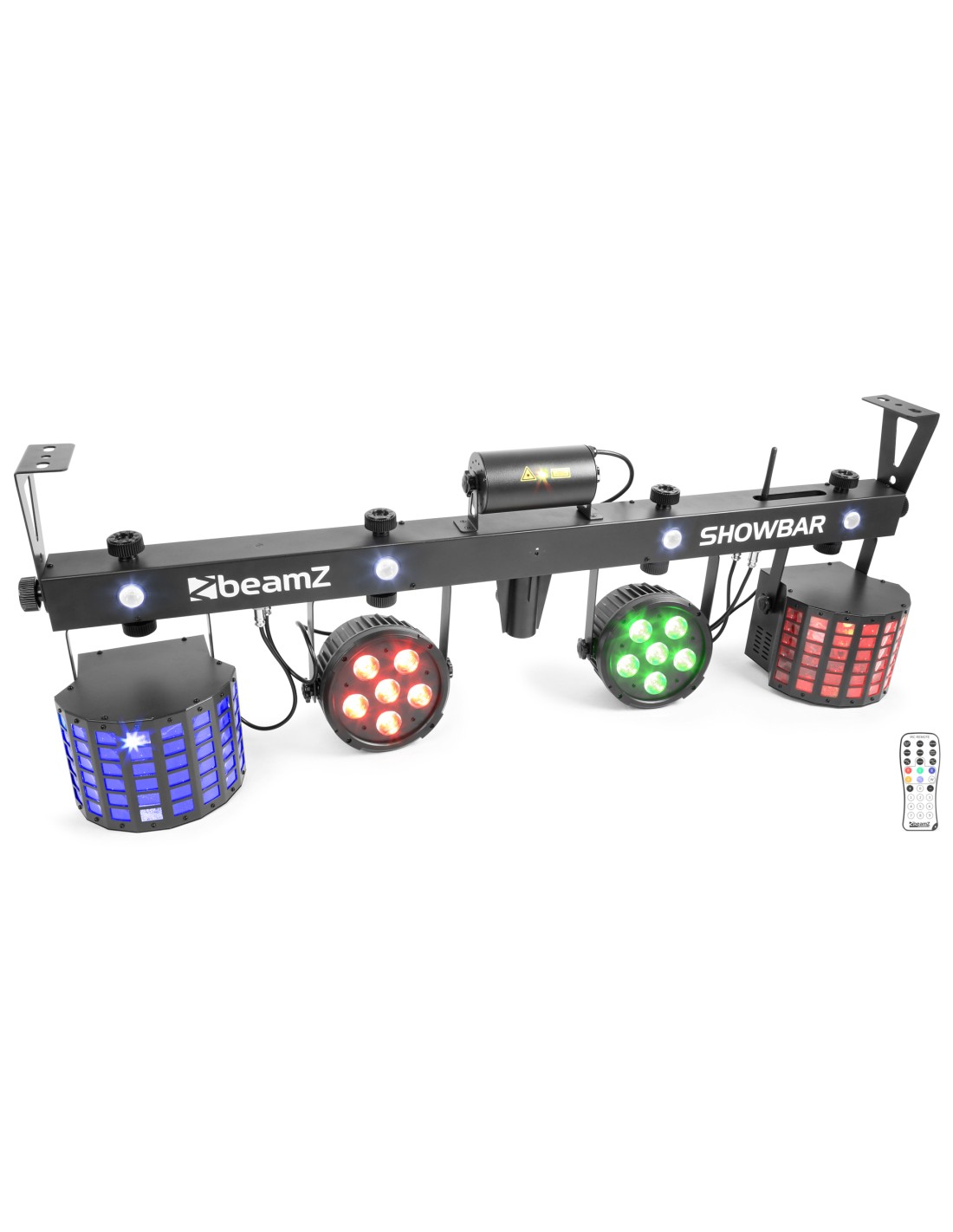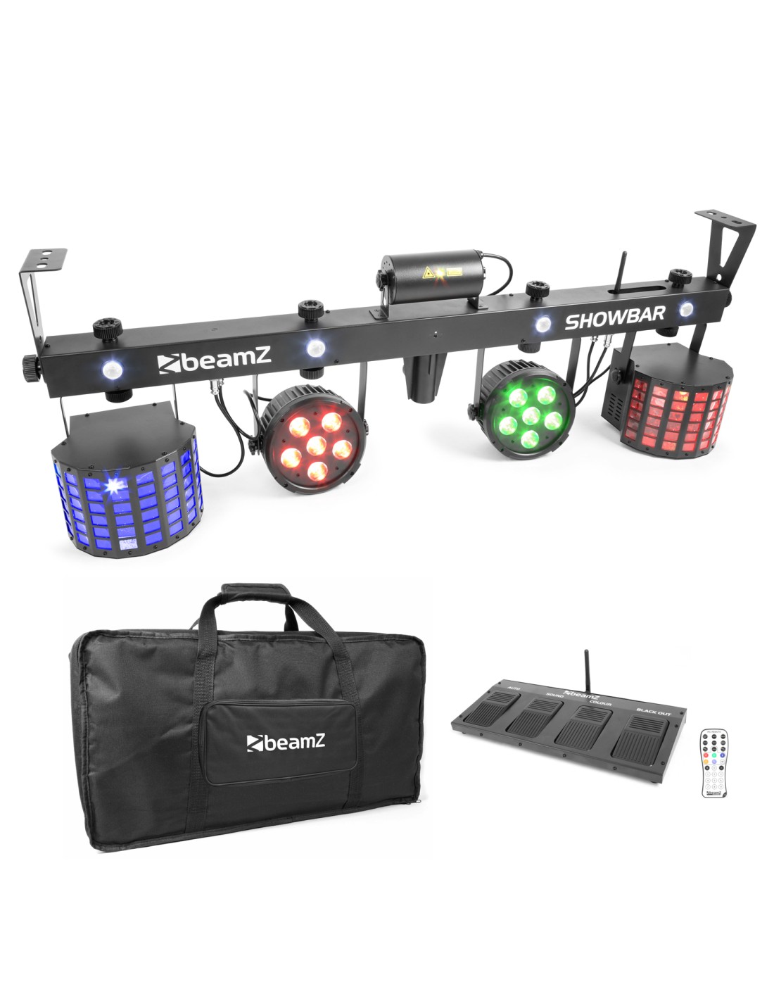 El nuevo SHOWBAR kit contiene 6 efectos montados en una barra T con DMX. El SHOWBAR incluye un par de Butterfly LED, una pareja de focos LED pars, un potente laser rojo y verde, y un efecto strobo. En la misma barra encontramos 4 leds Blancos de 1W para crear un efecto strobo espectacular. La barra T se puede controlar por 2 canales DMX en forma facil, o con 30 canales para un control total. La unidad esta equipada con un sensor IR para controlar a distancia mediante mando a distancia. Tambien se puede controlar con la pedalera inalambrica que permite saltar de modo auto a ritmo de la musica. Las unidades se pueden linkear facilmente gracias a sus conectores IEC y DMX. Este SHOWBAR se puede montar sobre tripode estandar de 38mm o colgar con soportes desde el techo.