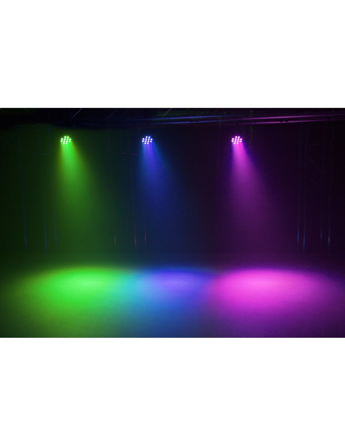 El foco Slim-PAR 35 es un foco Par potente equipado con 12x 3W LEDs RGB. Este Par se controla por DMX o autonomo o al ritmo de la musica. Cada color se puede controlar individualmente. Este foco no contiene ventiladores internos de refrigeracion, lo que significa que el ruido de trabajo es cero. Efecto ideal para disco movil, eventos en directo y cualquier aplicacion movil ademas de poder montarse en aplicaciones fijas como boleras, disco, club etc.