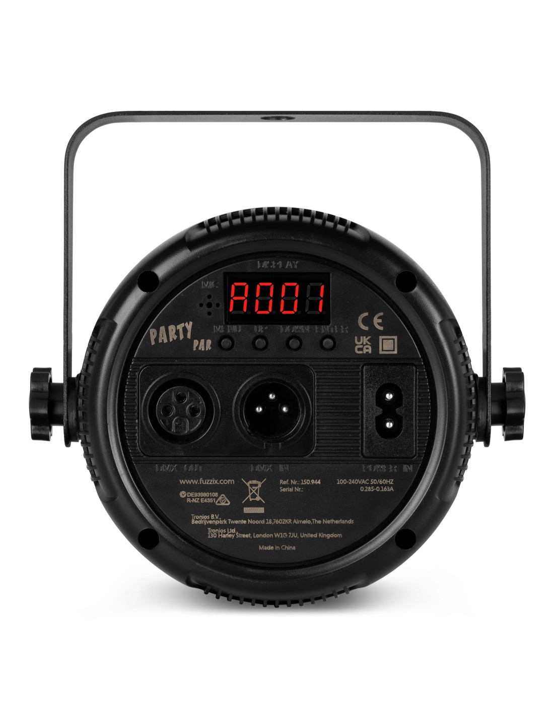 Lleva tu fiesta al siguiente nivel con la serie Fuzzix Party Par. Estas luces Par LED cuentan con LED de alta potencia y ofrecen una salida de luz increíble a un precio inmejorable. La carcasa de plástico robusto es especialmente funcional y resistente. Los colores se pueden ajustar individualmente mediante el mando a distancia incluido. Las capacidades DMX completas, la funcionalidad Sonido a Luz a través del micrófono integrado y una conexión Maestro/Esclavo garantizan que este Par pueda satisfacer todas sus necesidades. ¡Que empiece la fiesta!