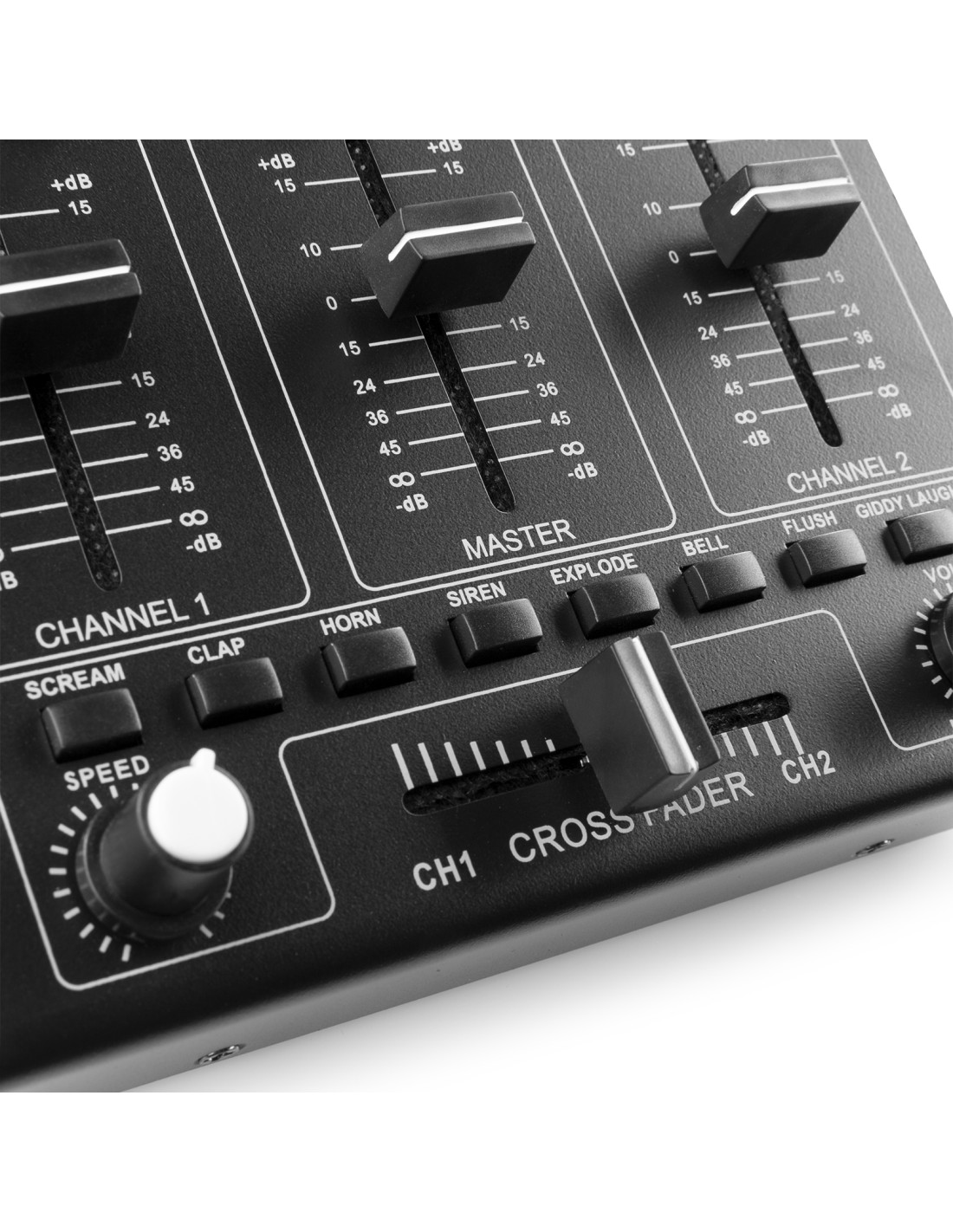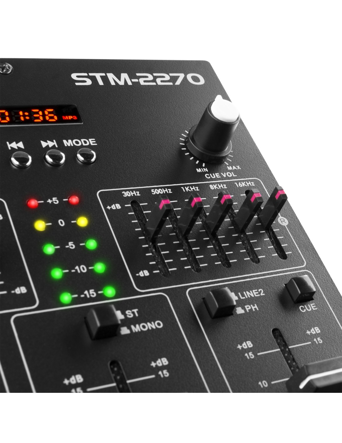 Mini mezclador de 4 canales de gran calidad. Este producto combina la técnica con el mejor diseño. Incluye receptor BT para reproduccion (streaming) de tu musica, reproductor MP3, ecualizador por canal de maestro, 8 efectos a tiempo real, funciones cue y crossfader asignable, etc. Se pueden conectar 2 lineas y un giradiscos.