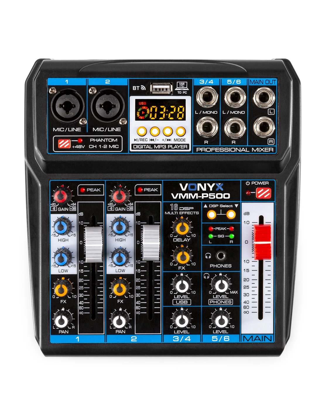 El VMM-P500 es una mesa de mezclas compacta con 4 canales y 16 efectos analógicos DSP e interface integrada estéreo USB para conectar directamente un ordenador. La alimentación Phantom de +48V es seleccionable en las entradas XLR para usar micrófonos de condensador. Ideal para DJs, músicos, podcasters, compositores y uso en escenario. Se puede alimentar con el adaptador suministrado o a través del USB del ordenador. También para aplicaciones de disco móvil, pequeños grupos y cantantes.