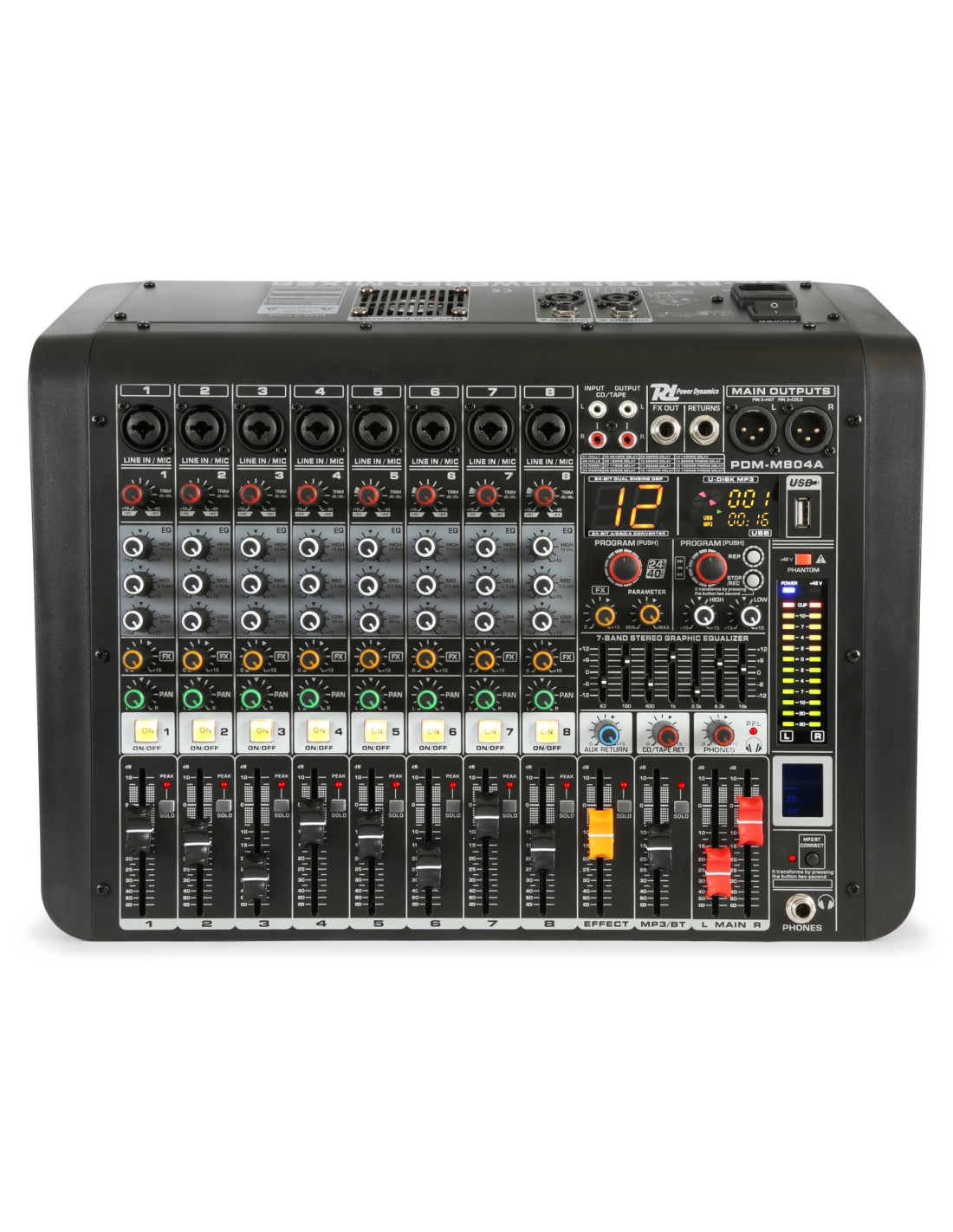 Mezclador de directo de sobremesa con amplificador integrado y funciones muy atractivas. Incluye mute y solo en cada canal, reproductor por USB con display digital y receptor BT para audio streaming durante las pausas. Ideal para directos y pequeños grupos.