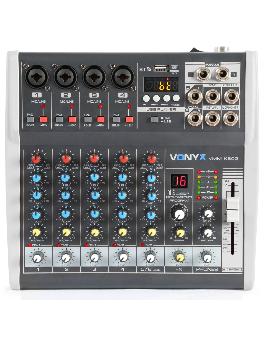 Mezclador de directo facil de usar y a un precio razonable. Control de agudos, medios y graves por canal. Alimentacion phantom individual por canal haciendo de esta unidad perfecta para directo y estudio de grabacion.