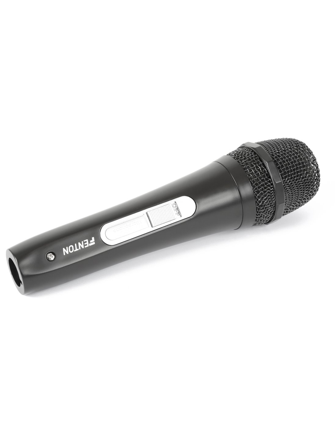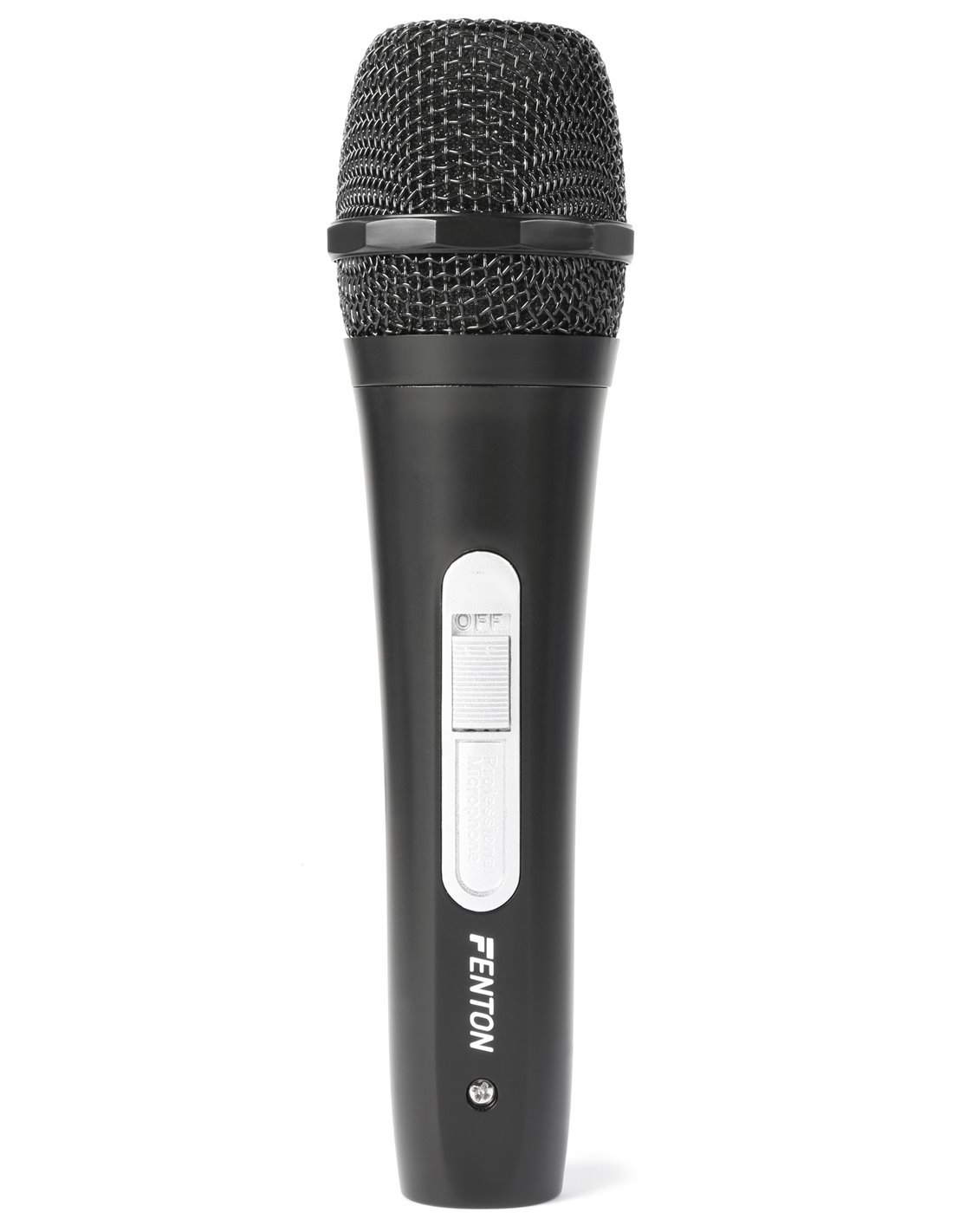 Micrófono dinámico negro, de forme esbelta, equipado con rejilla de protección metálica y filtro antiruidos integrado.