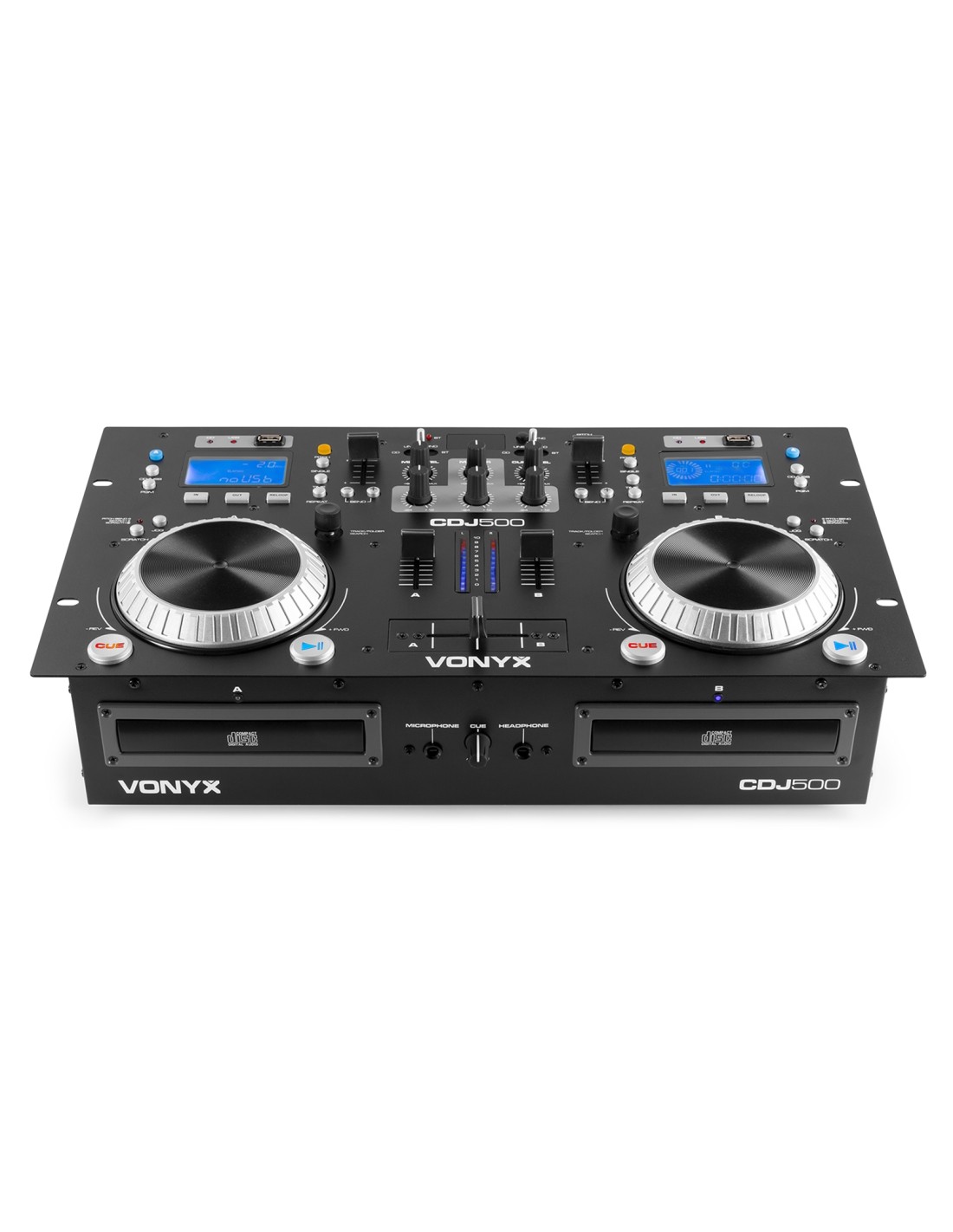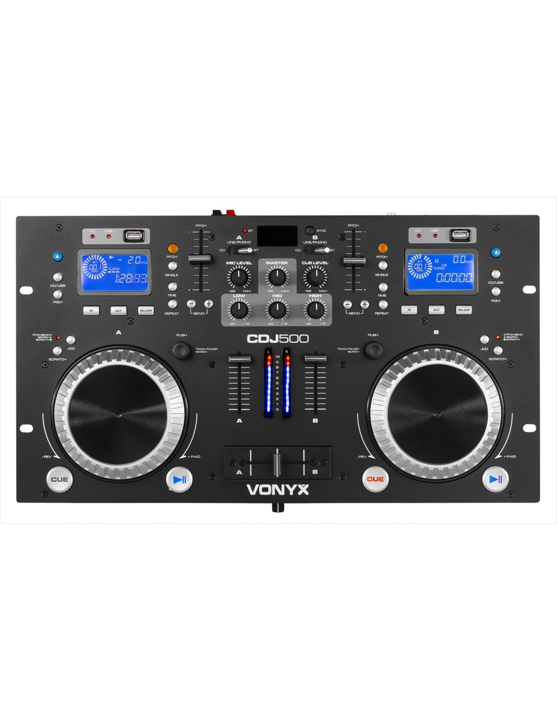 El CDJ500 es una combinacion de un doble reproductor media con un amplificador integrado (2 x 100W) y mezclador para reproducir y mezclar pistas desde CD, USB o via BT. Equipado con dos pantallas LCD. Incorpora mezclador DJ de 2 canales, crossfader, ganancia y 2 jog wheels ergonomicos. El reproducctor se completa con biusqueda or carpetas, seleccon de pistas, programacion, Search/Scratch y control Pitch. Perfecto para el DJ moderno!