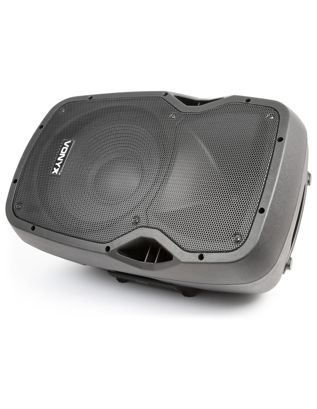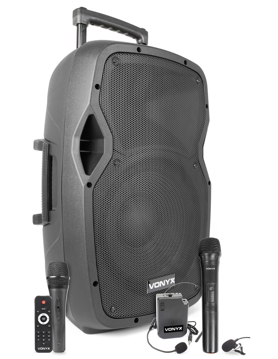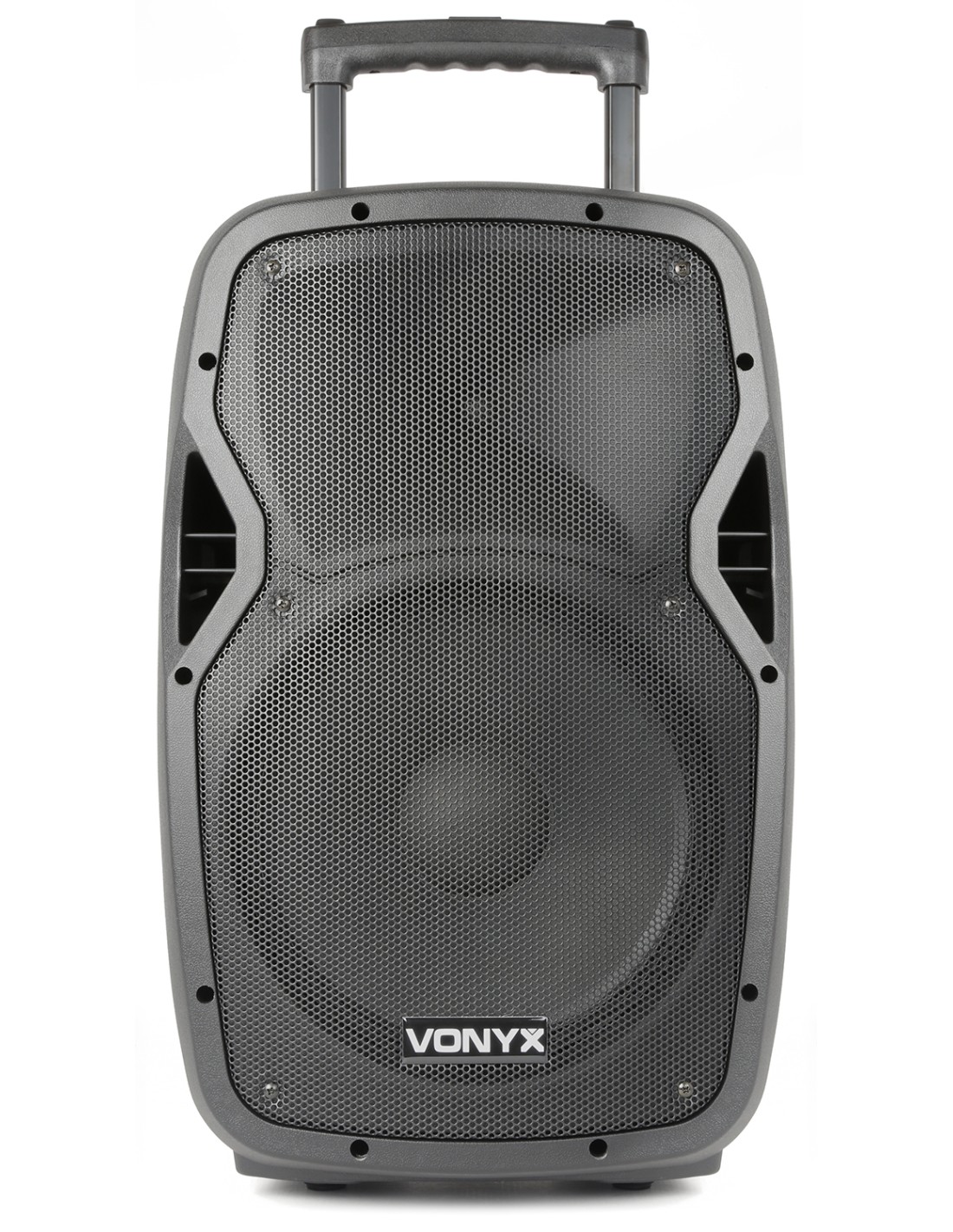 Bafle portatil PA profesional 12" 600W con mando a distancia, puerto USB integrado y lector SD Card para reproducir ficheros MP3. Este sistema "todo en uno" viene equipado con un receptor BT para reproducir en streaming y con UHF transmisores de petaca y mano que operan los dos a la vez. Se alimenta a corriente o con bateria incorporada de 12V que lo hace totalmente independiente. Incorpora asas de transporte y ruedas. En la parte trasera trae dos entradas mas para microfonos de cable con efecto echo para todos micros, entrada AUX linea, controles de tono etc. Este sistema completo es indispensable en cualquier evento donde se necesite musica..