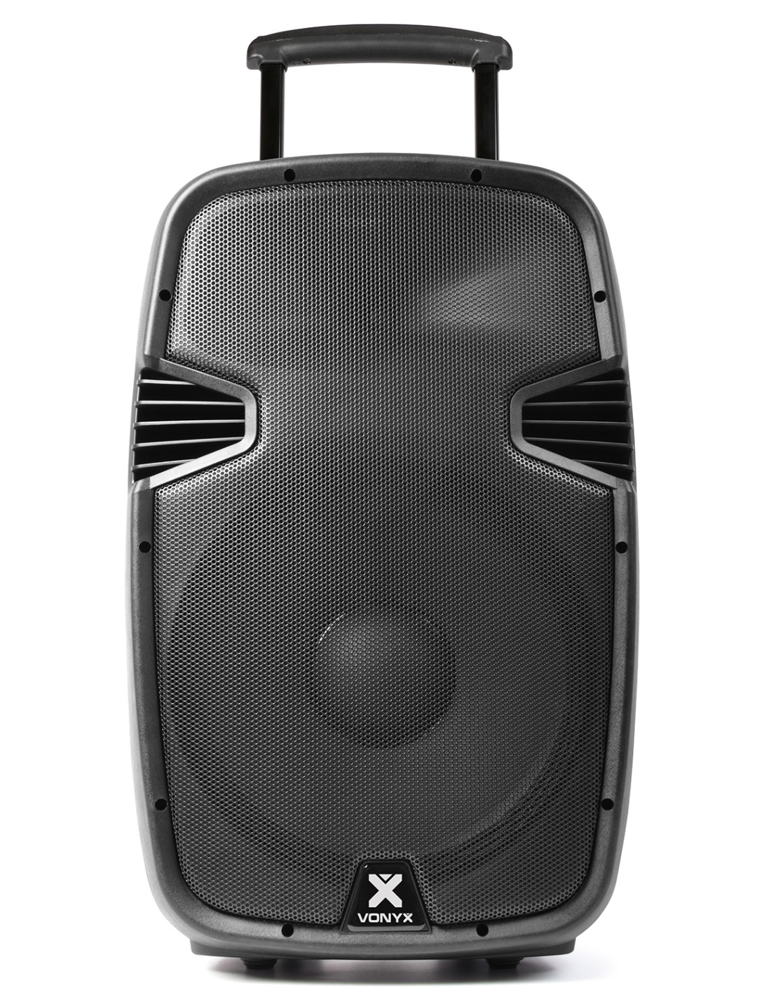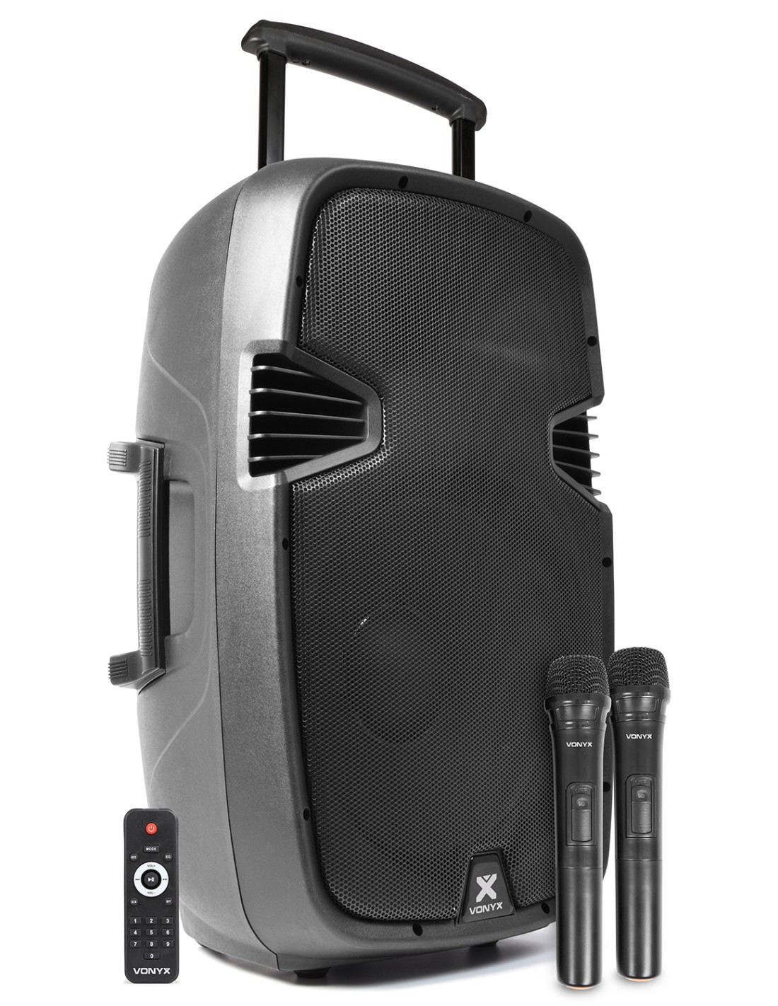 Sistema de sonido profesional movil de 15" 700W incorporando 2 micros inalambricos por UHF que operan en distintas frecuencias, mando a distancia y reproductor integrado de MP3 por USB y SD Card. Este sistema todo en uno, se alimenta por 220v o por bateria interna recargable de 12V para mover el woofer de 15" y motro de agudos. En la parte trasera encontramos 2 entradas para micro con efecto echo, entrada de linea, controles de MP3 y ecualizador de 5 bandas.