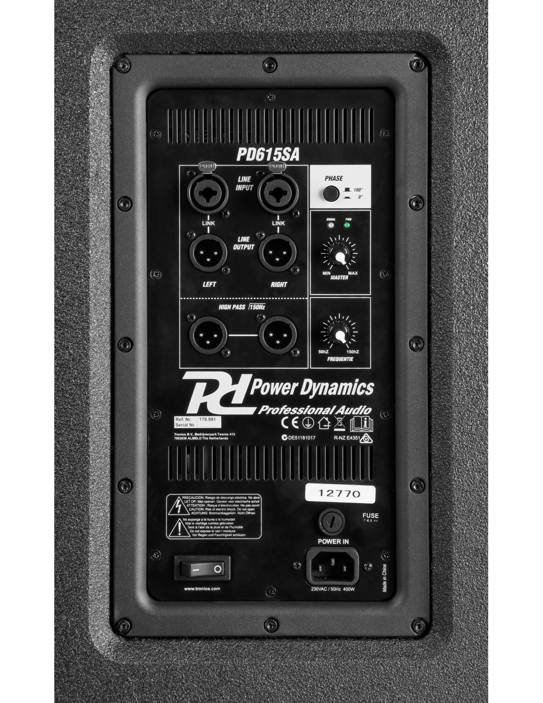 Este subwoofer activo de 15" PA tiene una potencia musical de 500W, generando una presion acustica de 128dB. El subwoofer cuenta con crossover interno para cortar las frecuencias altas y mandarlas a los satelites. La unidad cuenta con salida de señal completa para conectar a otro subwoofer y salida filtrada para los satelites. El crossover interno puede ajustarse a 50Hz o 150Hz.