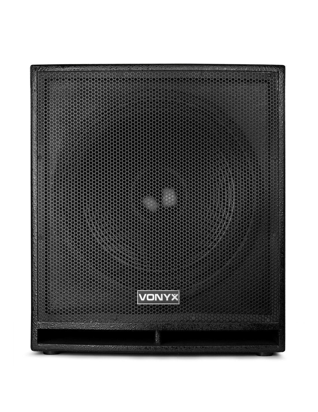 Subwoofer de 18" con filtro pasa bajos ajustable entre 40Hz y 250Hz. Incorpora amplificador de 1200W con control de fase para sincronizar con los altavoces principales, reproduciendo unos graves profundos. Conexiones dobles IN/THRU para linkear a otro subwoofer.
