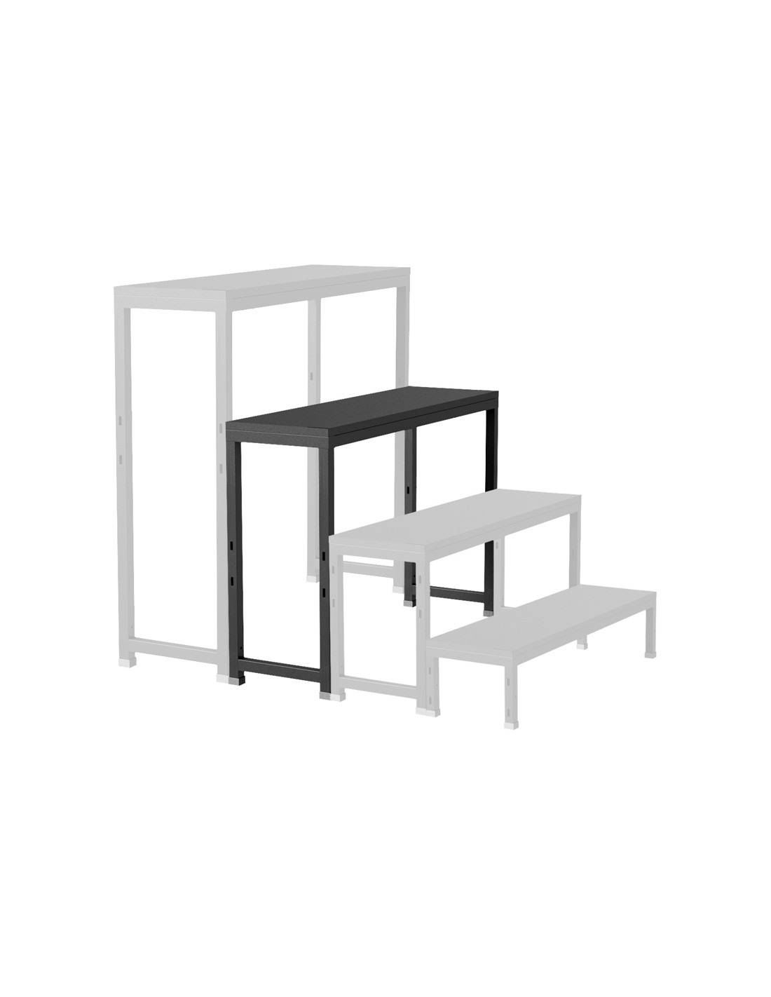 Escalera modular fija con cuatro alturas disponibles. La escalera tiene patas ajustables para posibilitar la conexion con tarimas no niveladas. La escalera tiene estructura de acero y los escalones son de madera con cobertor vinilico "Hexa" anti deslizante para asegurar maximo agarre permitiendo su uso en interior o exterior.