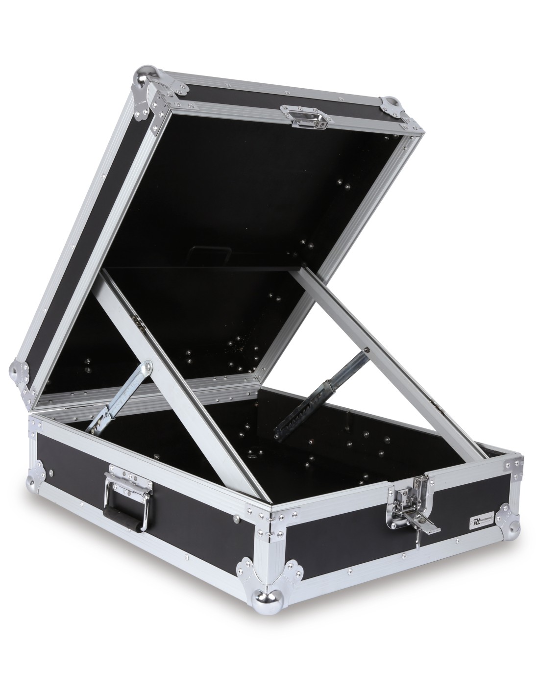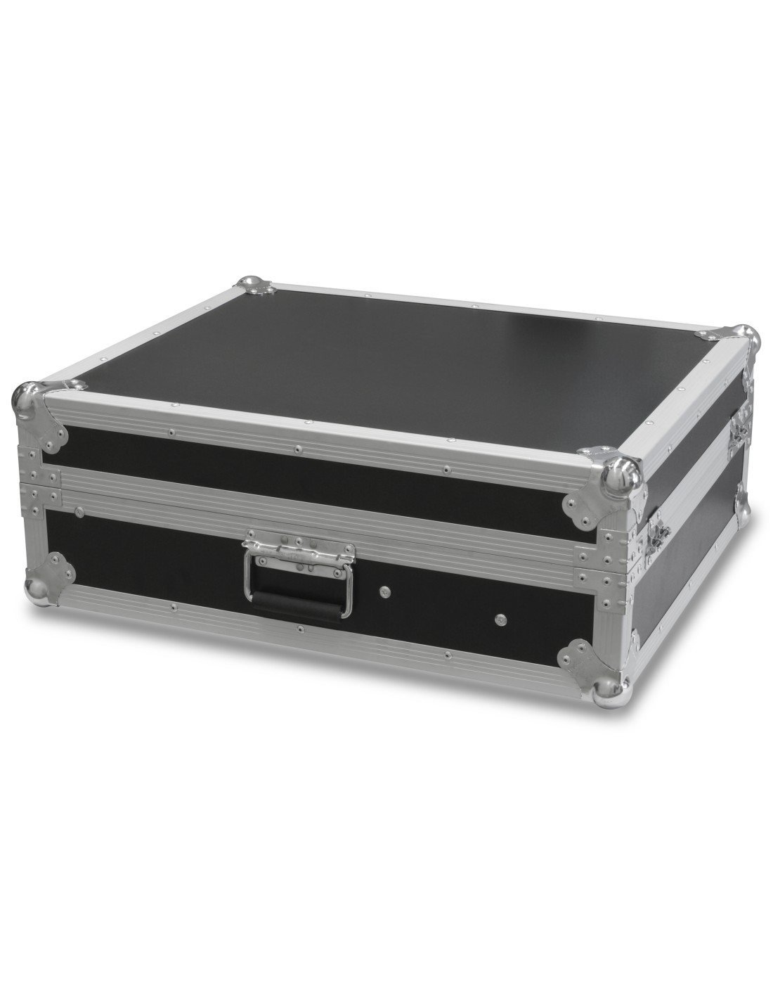Maleta para mezcladores de hasta 12U de alto. Railes de sujeccion inclinados para mayor facilidad de uso de tu mesa, controladora, etc.. Fabricado en madera plywood con acabado en negro, perfiles en aluminio, cantoneras de acero y cierres de gancho. Este flightcase esta acabado con 2 asas de muelle y cierres de palomilla.