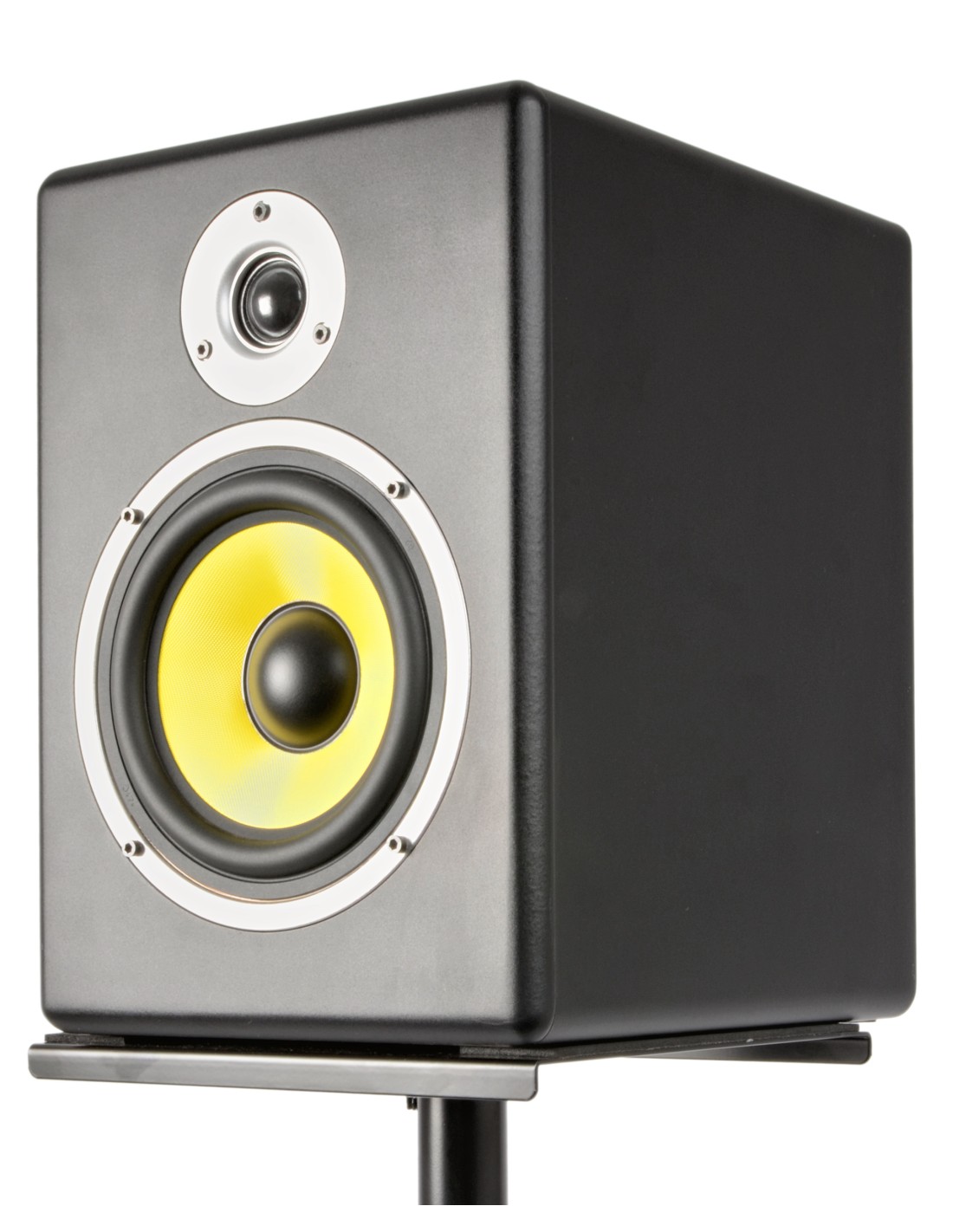 Pie triangular para monitor ajustable en 3 pasos con pasador de seguridad y gran tornillo de fijacion. Incluye puntas de contacto a suelo y una plataforma metalica de apoyo con 2 tiras de goma antideslizante. Util para casa, aplicaciones y estudio.