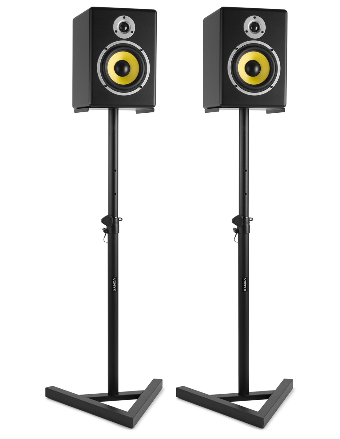 Los soportes Vonyx SMS20 para monitor de estudio son firmes y duraderos, para mantener sus monitores de estudio en correcta posicion. Los soportes tienen base triangular para ofrecer estabilidad con sus patas de goma para evitar deslizamientos. No importa que tipo de monitores tengas, los soportes Vonyx añadiran un toque extra de profesionalidad al conjunto.