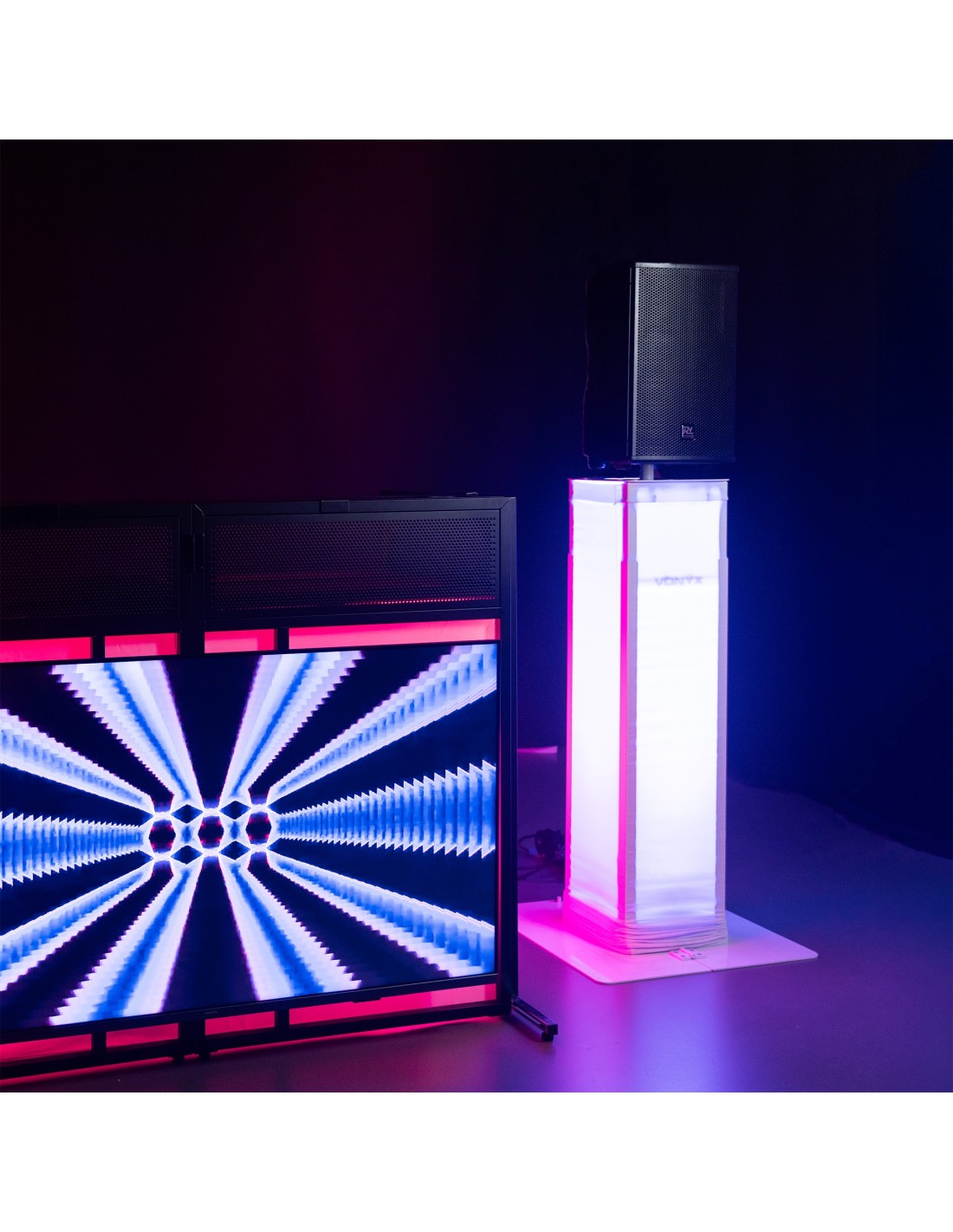 El DJP170 es un pedestal ajustable con placa base plegable para colocar efectos de luces y cabezas móviles, como bafles de PA, o cualquier unidad para exponer. A diferencia de otros pedestales ajustables que utilizan palomillas para cambiar la altura de la unidad, el DJP170 se ajusta en altura instantáneamente con el ajuste mecánico diseñado especialmente para Vonyx que libera los cuatro cierres a la vez, permitiendo que con una sola mano ajustemos la altura deseada. El pódium tiene un acabado en pintura de alta Resistencia y durabilidad. Una licra negra y otra blanca para cubrir las patas, bolsa de transporte y alfombrillas antideslizantes, vienen incluidas en el conjunto.