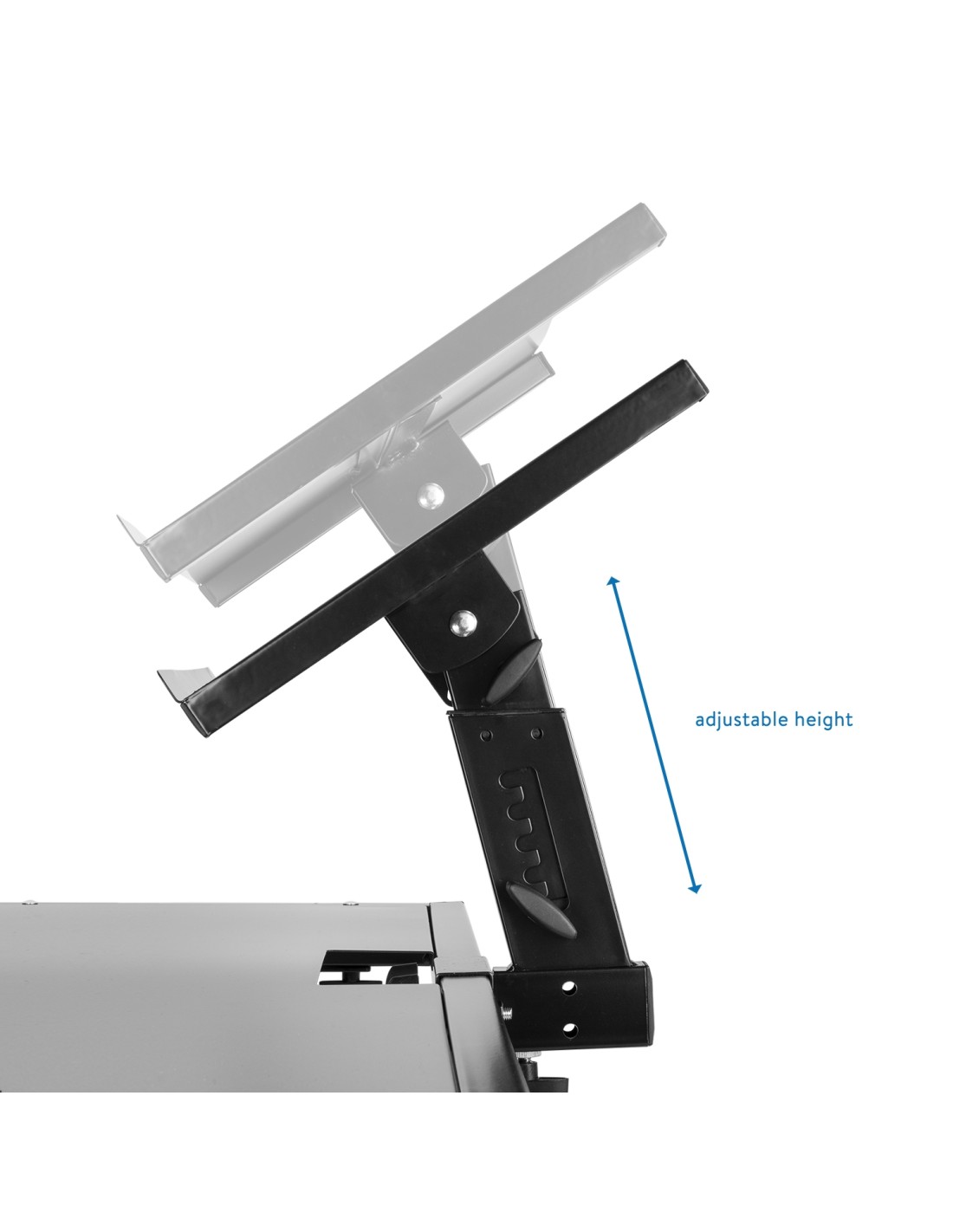 Este stand DJ es ideal para mezcladores, consolas, controladores, portatiles, etc. Es facil de montar y construido en material resistente. En un acabado negro elegante y regulable en altura. La plataforma es ideal para portatil y otros equipos pequeños.