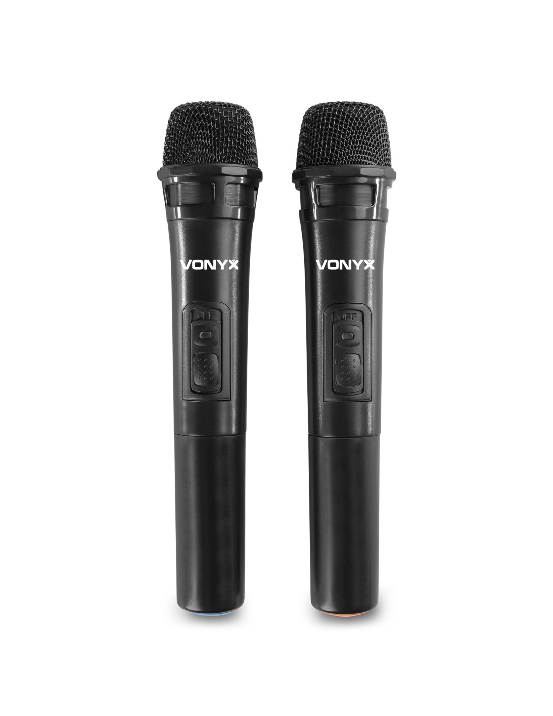 Incluye 2 micrófonos de mano UHF con control de volumen independiente y efecto de eco conmutable