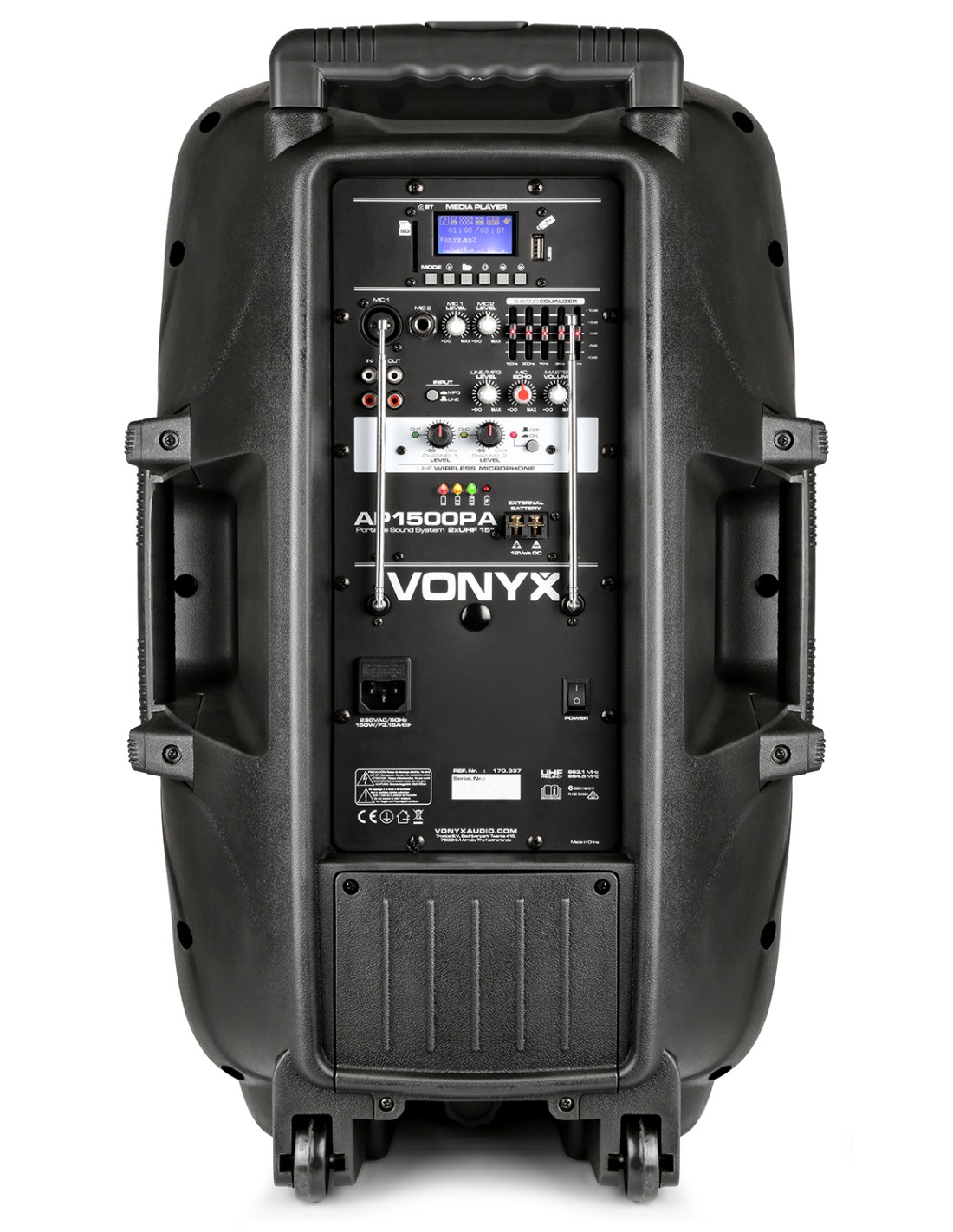 Bafle portatil PA profesional 15" 800W con mando a distancia, puerto USB integrado y lector SD Card para reproducir ficheros MP3. Este sistema "todo en uno" viene equipado con un receptor BT para reproducir en streaming y con 2 microfonos inalambricos UHF que operan los dos a la vez. Se alimenta a corriente o con bateria incorporada de 12V que lo hace totalmente independiente. Incorpora asas de transporte y ruedas. En la parte trasera trae dos entradas mas para microfonos de cable con efecto echo para todos micros, entrada AUX linea, controles de tono etc. Este sistema completo es indispensable en cualquier evento donde se necesite musica..