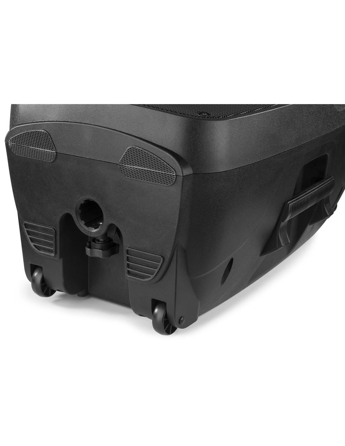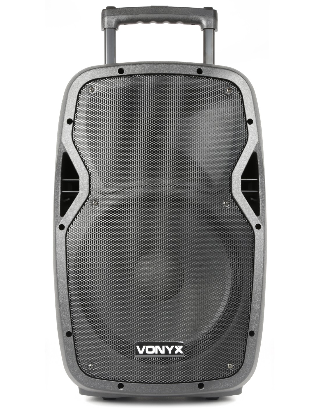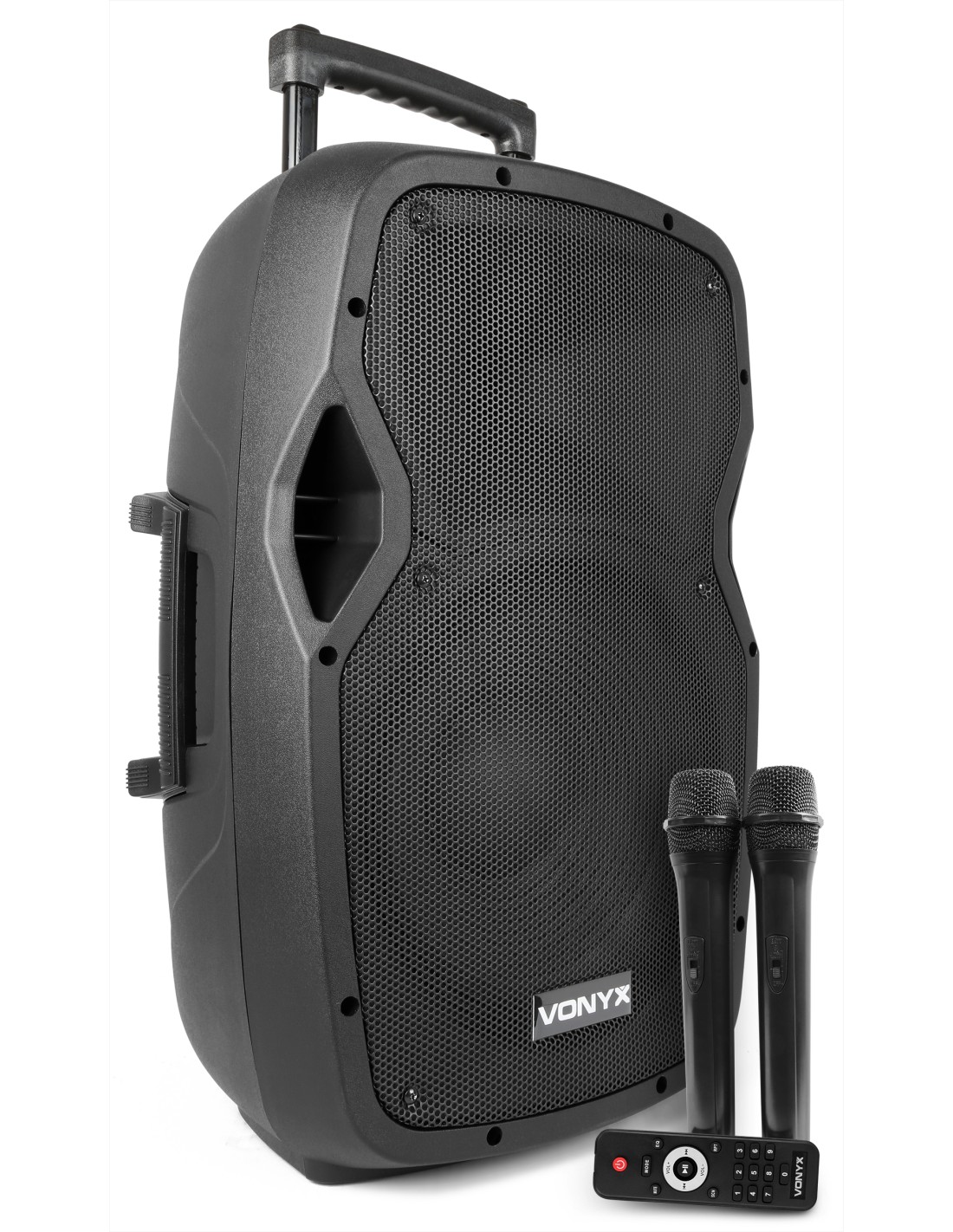 Bafle portatil PA profesional 12" 600W con mando a distancia, puerto USB integrado y lector SD Card para reproducir ficheros MP3. Este sistema "todo en uno" viene equipado con un receptor BT para reproducir en streaming y con 2 microfonos inalambricos UHF que operan los dos a la vez. Se alimenta a corriente o con bateria incorporada de 12V que lo hace totalmente independiente. Incorpora asas de transporte y ruedas. En la parte trasera trae dos entradas mas para microfonos de cable con efecto echo para todos micros, entrada AUX linea, controles de tono etc. Este sistema completo es indispensable en cualquier evento donde se necesite musica..